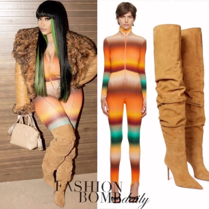Fans have been voicing their love for Nicki Minaj’s recent look at the Powerhouse 2022 hip-hop concert in Philly! Seen in the below clip showing off her moves this past Friday, Nicki wore a $385 multicolor jumpsuit by Turkish womenswear label SIEDRÉS and $1,359 Amina Muaddi Jahleel suede over-the-knee boots.