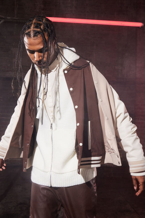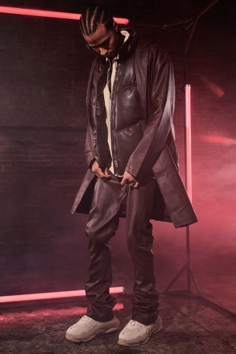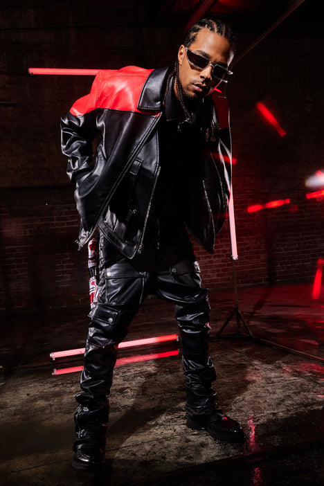 Clad in a black and red color story with hints of brown and cream, Nova Men’s latest collection is fit for a versatile group of men. A faux leather double-breasted suit may appeal to the fashion-first guy who favs every Wisdom Kaye’s reel, while the neutral-toned varsity jackets fit in most streetwear wardrobes.