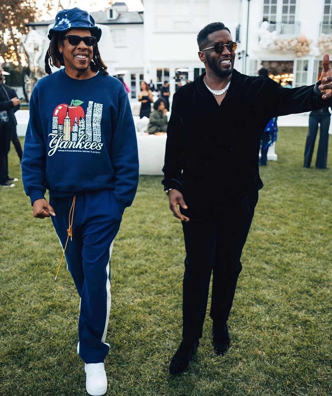 Jay-Z also came by to share a moment with Puff in a $75 Paper Planes Tie Dye Jacquard Terry Cloth Bucket Hat in Navy, $680 navy blue Rhude track pants available at SSENSE and a $175 Madhappy Yankees Fleece Crewneck.