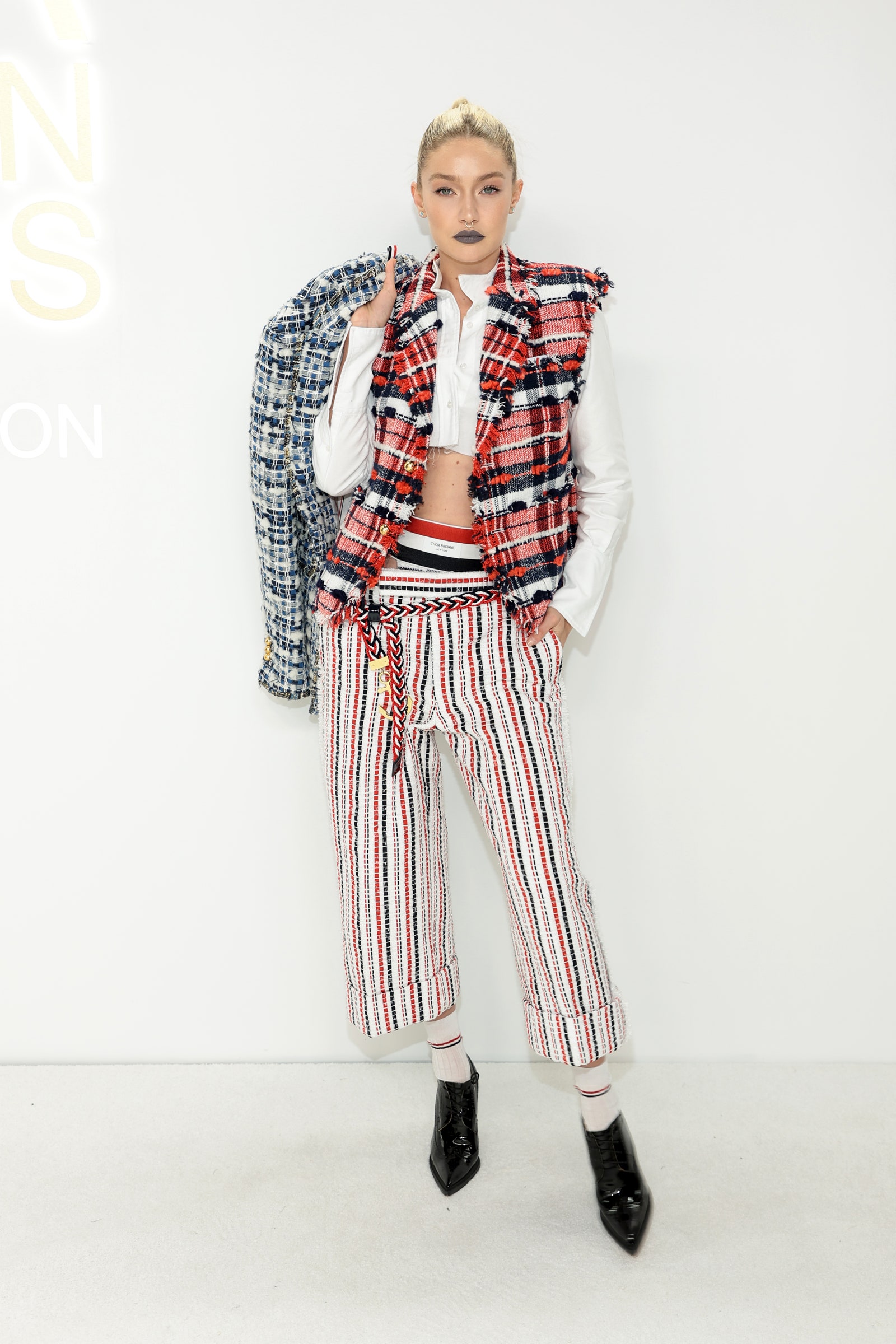 Gigi Hadid made a case for cool in a multi tweed Thom Brown look. The cropped shirt and low rise trousers make the look fresh and modern, but the gunmetal grey lips top it off brilliantly.