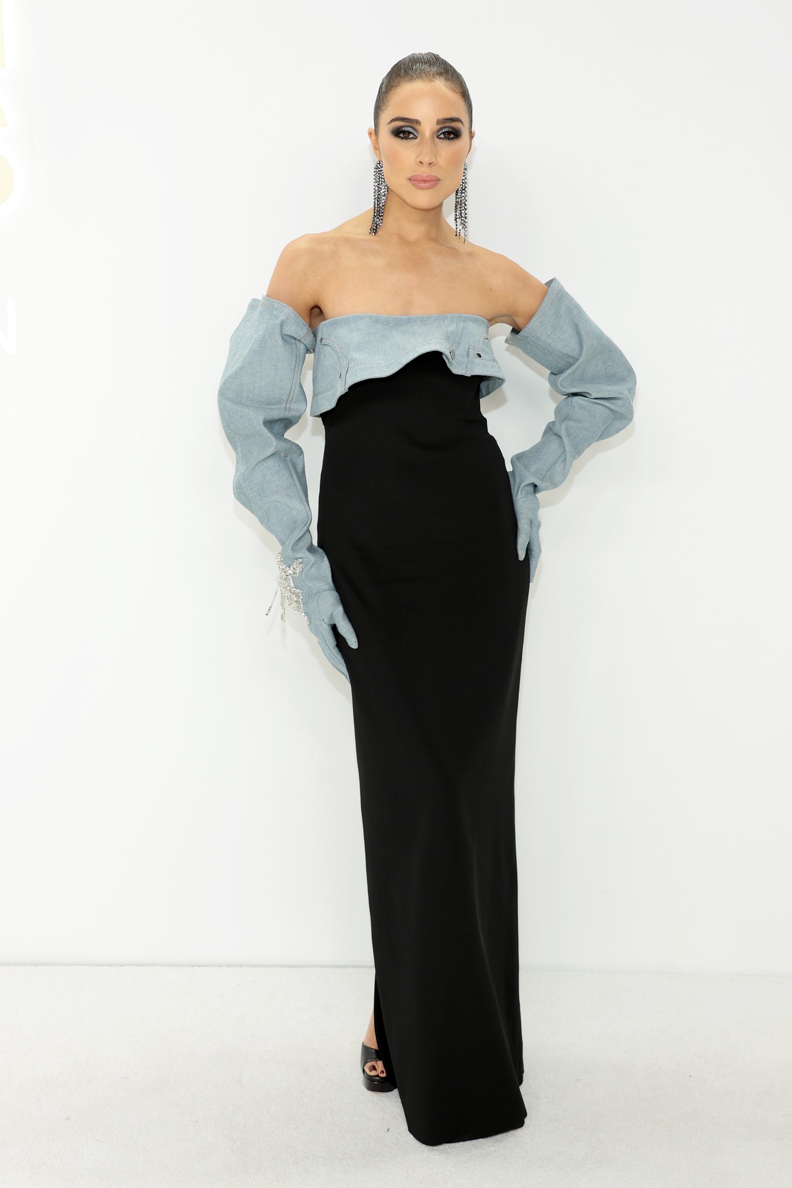 Denim deserves a moment on the red carpet says Olivia Culpo who pulled up in a spliced denim gown. While the ruffle denim neckline adds interest to the otherwise common black strapless gown, the slouchy denim opera gloves take this look from modern elegance to a Black Tie meets streetwear confection.