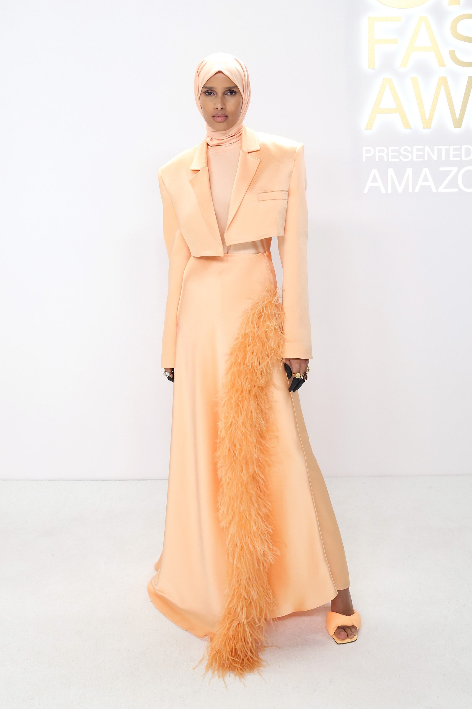 Rawdah was pretty in peach La Pointe. The satin feathered skirt and cropped blazer were sleek and chic but the black dyed fingers really set the whole look off.