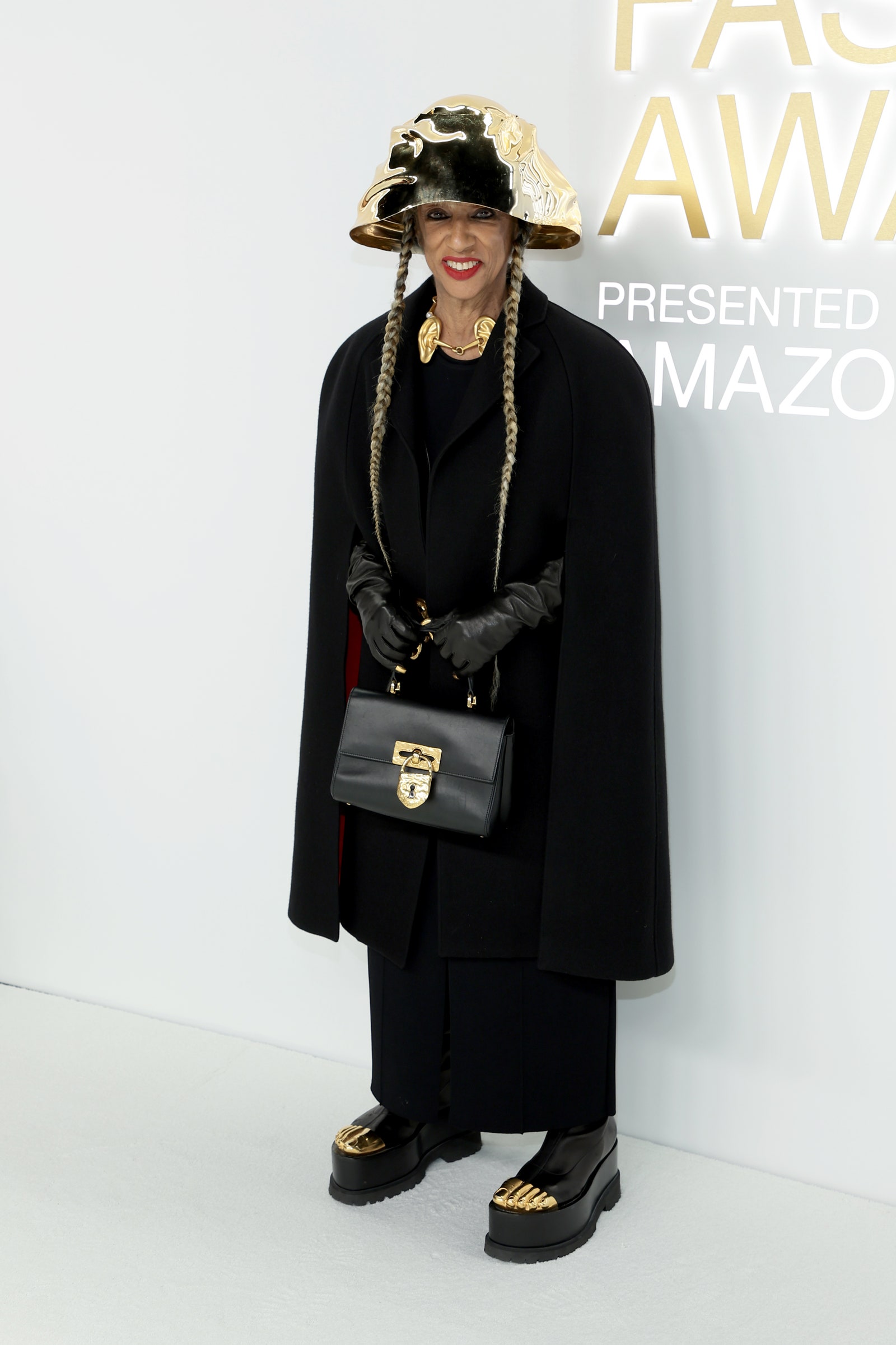 Media Award winner Patti Wilson served surrealism in Schiaparelli. While a black wool cape coat over a black wool dress is an undeniably chic ensemble, Patti makes it a look you can’t stop looking at with gold toe platform boots, gold finger nail gloves, a gilded ear necklace and a gold lampshade headpiece.