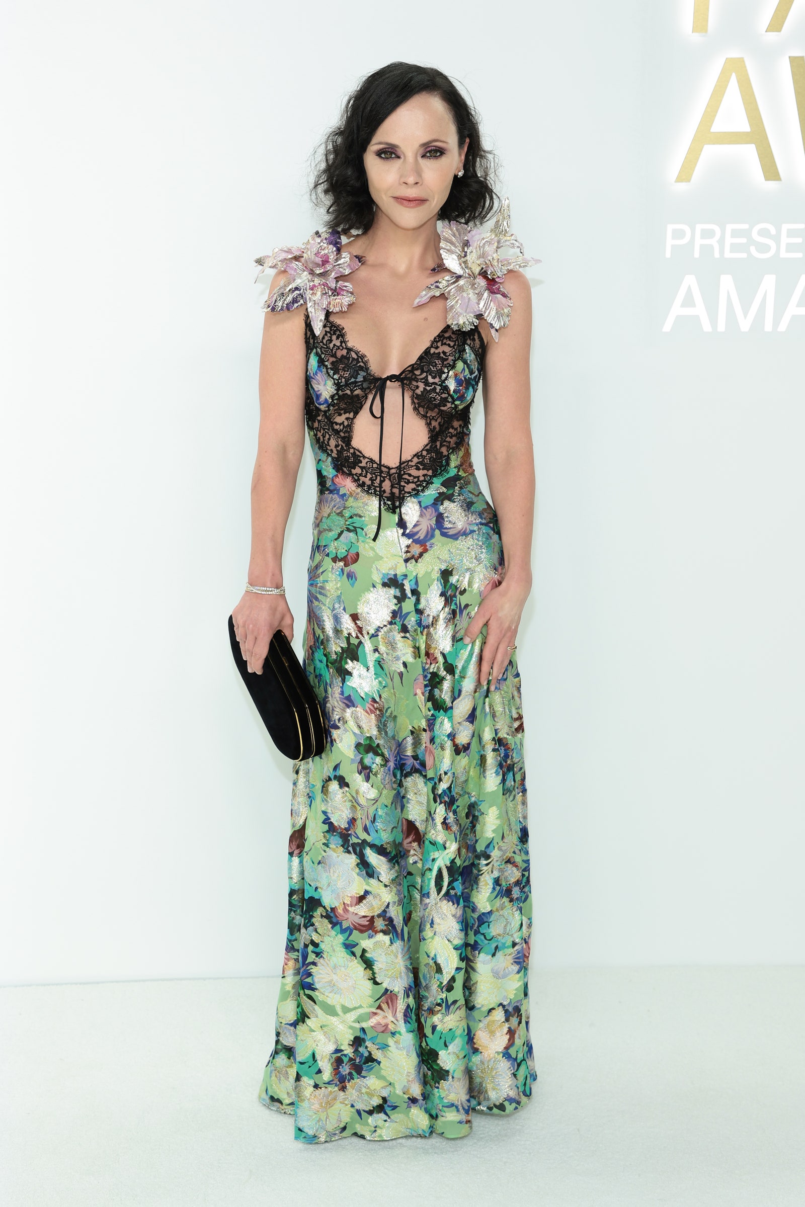 Romance was served the minute Christina Ricci stepped onto the red carpet in metallic floral appliqué, delicate black lace and a silk floral skirt.