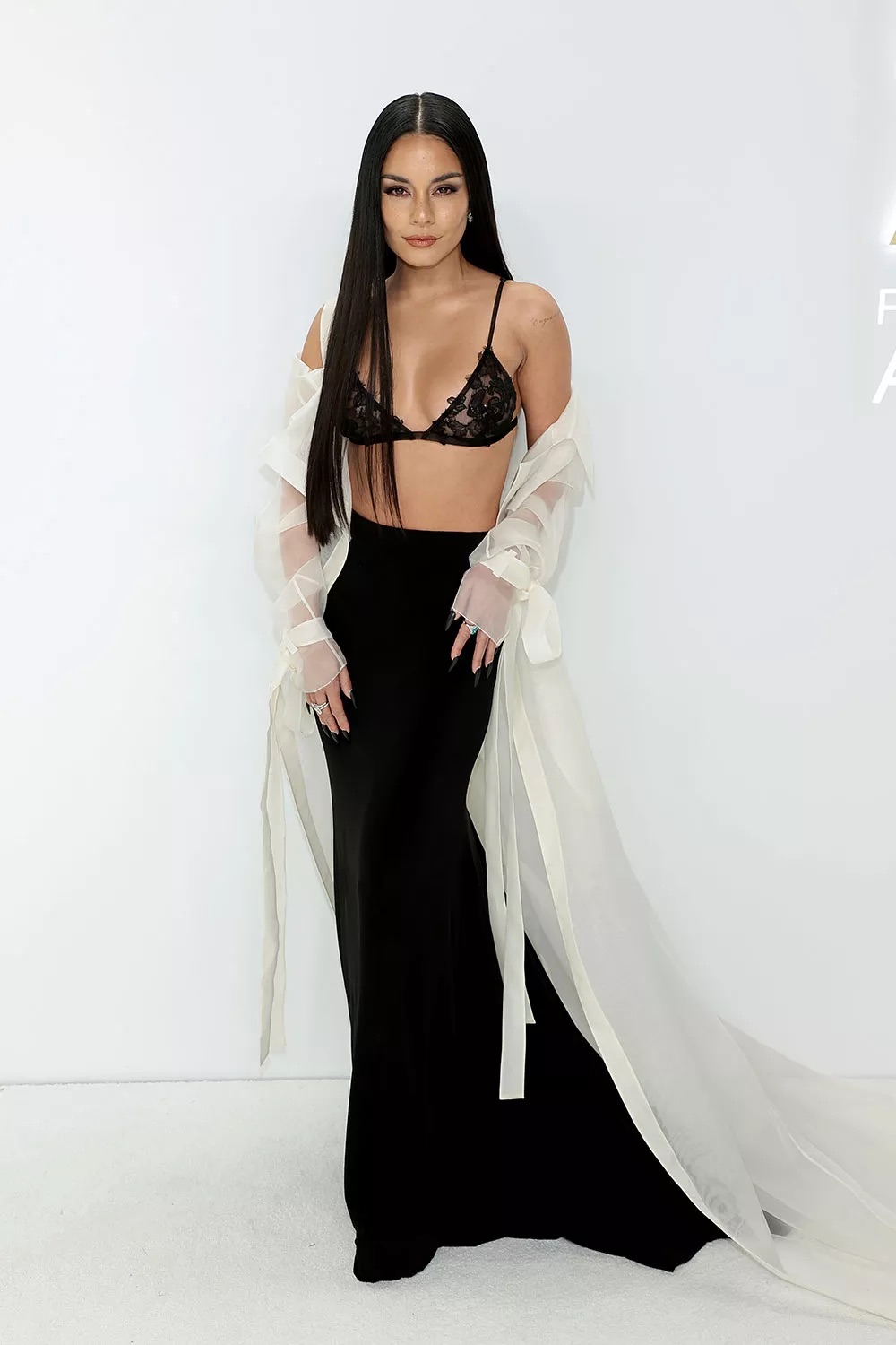 Musical star Vanessa Hudgens stepped into her supermodel bag for the fashion awards. The beautiful draping of the organza robe and lace in the bralette give this look a slight lingerie feel while the center parted bone straight tresses and light smokey eye make this look magazine cover ready.