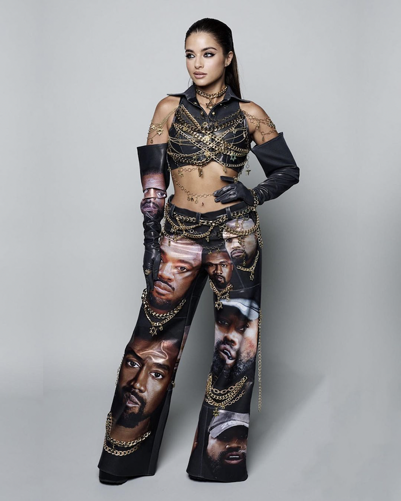 While this may be a polarizing conversation, it’s a necessary one for us as a society to have. Between fan speculations, mixed messaging from celebrities and the pressure for brands to pick a side, one side of the story remained overlooked until recently. Israeli pop star Noa Kirel went certified viral for her MTV European Music Awards outfit: a custom design by Yuvalal Roey with Kanye’s face plastered all over a pair of black leather pants and leather gloves, embellished with gold chains and symbolic charms associated to Jewish heritage.