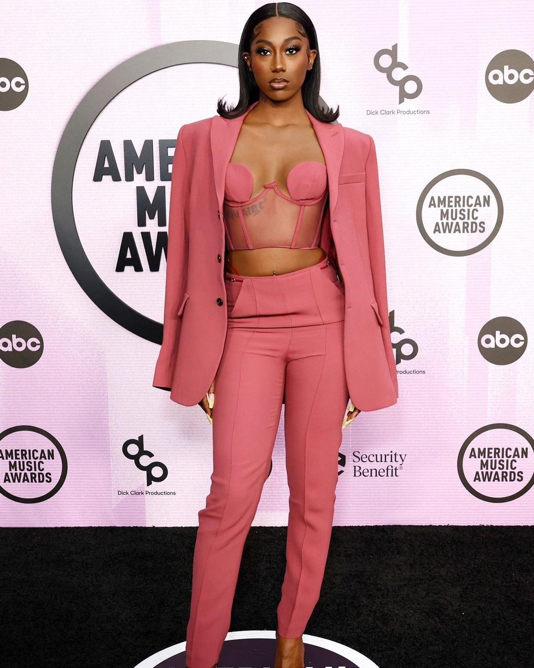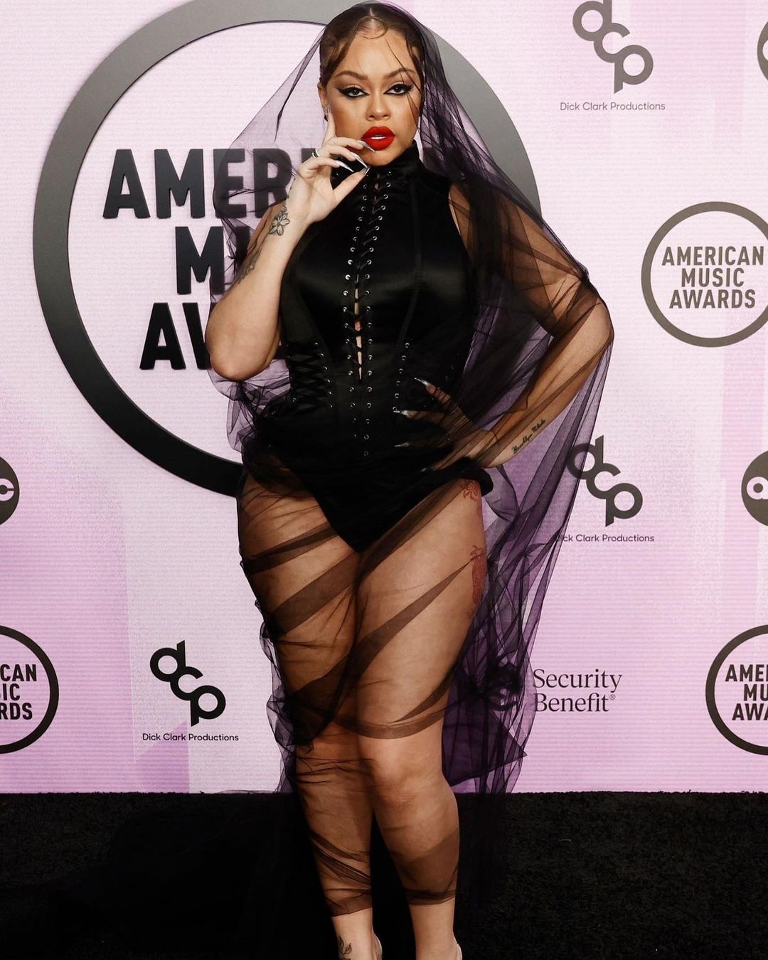 Also wearing a custom design for the evening, Latto wore a corset style bodysuit with a tulle veil by Dilara Findikoglu. Her ’fit was styled by Sam Woolf while hair was done by The Lace Assassin and makeup by Priscilla Ono.