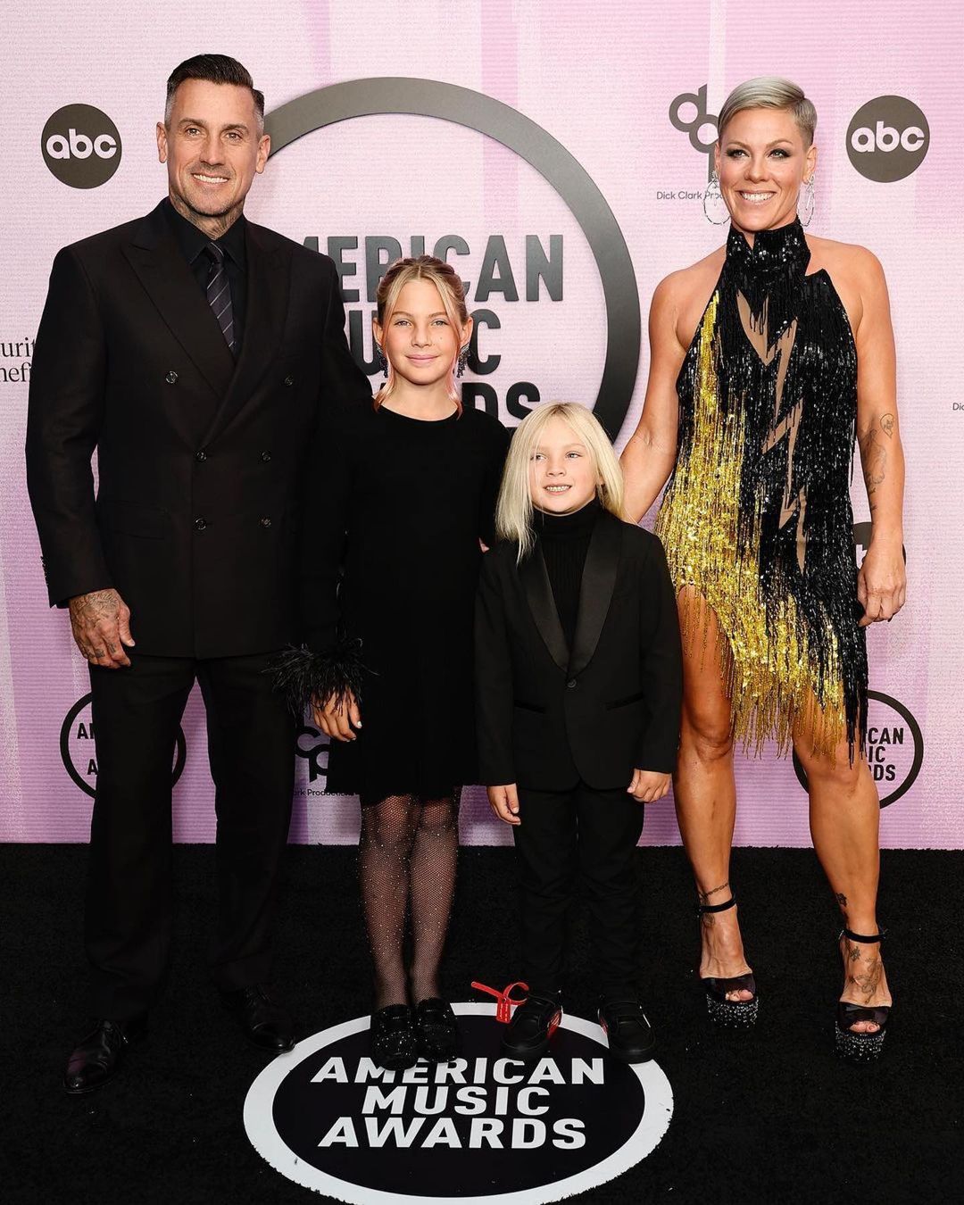 This family is on fire! In a black and gold sequins vintage tassel dress by Bob Mackie, Pink attended the awards with her husband and two children.