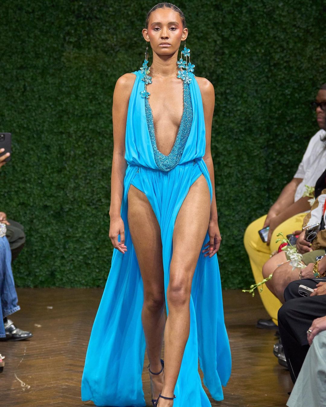 Ari took us to the tropics in an aqua look 19 from Aliétte’s Spring Summer 2023 collection. The outfit was styled by Marisa Ellison.