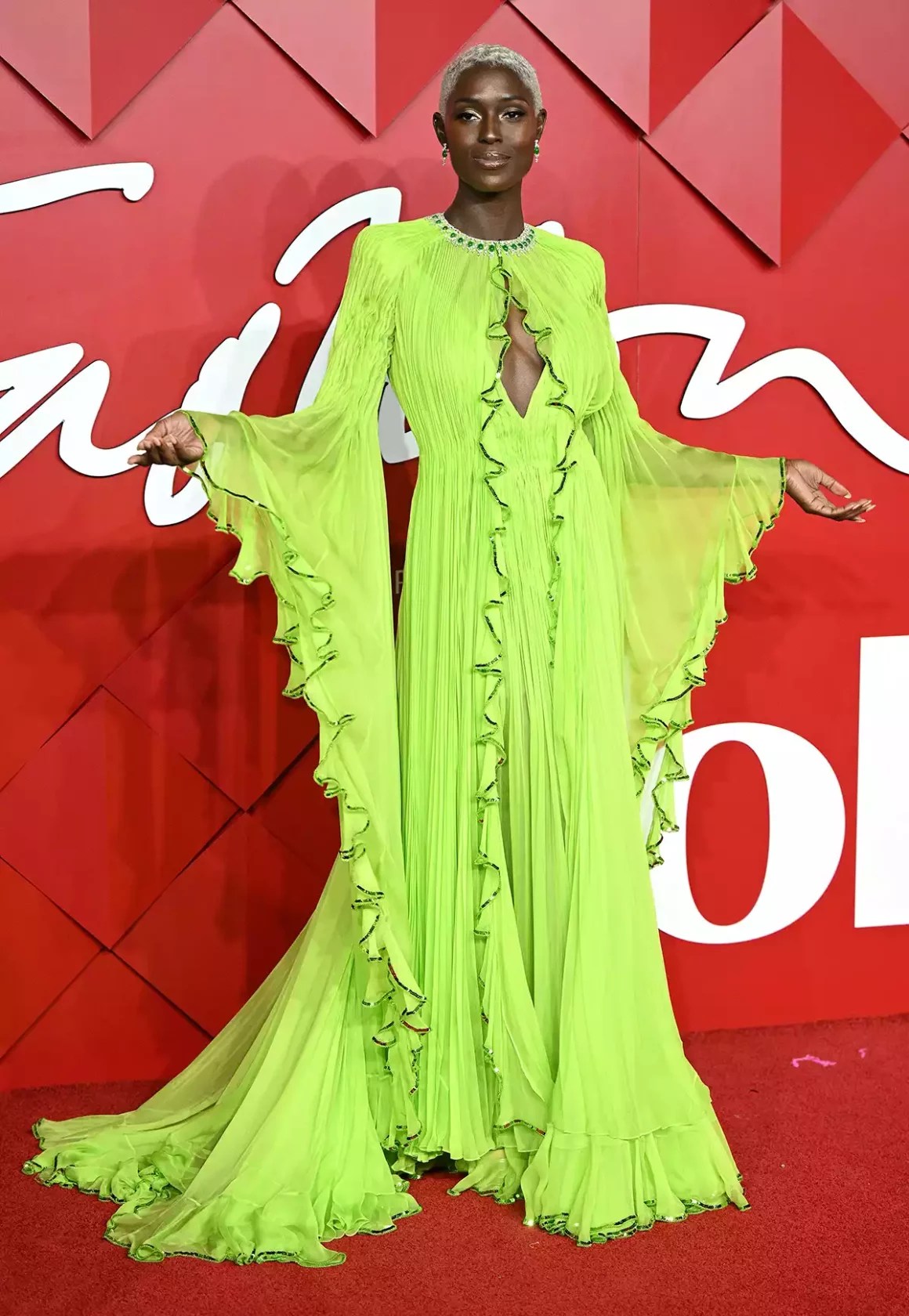 Turner-Smith arrived at the awards in an attention-grabbing Gucci gown. Photographers and attendees were treated to a dreamy highly-saturated masterpiece that flowed beautifully with her every move. A gleaming green sequin trim complemented her emerald jewelry.