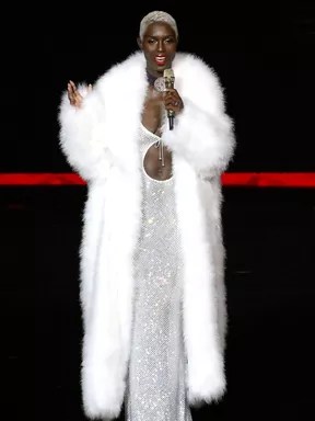 Following the drama came a little sparkle. Turner-Smith strutted onto the stage in a stunning silver look fit for a long night of dancing and debauchery at Studio 54. Her diamond white fur coat is a look on its own, but the sparkly 16Arlington gown she wore underneath was the real showstopper.