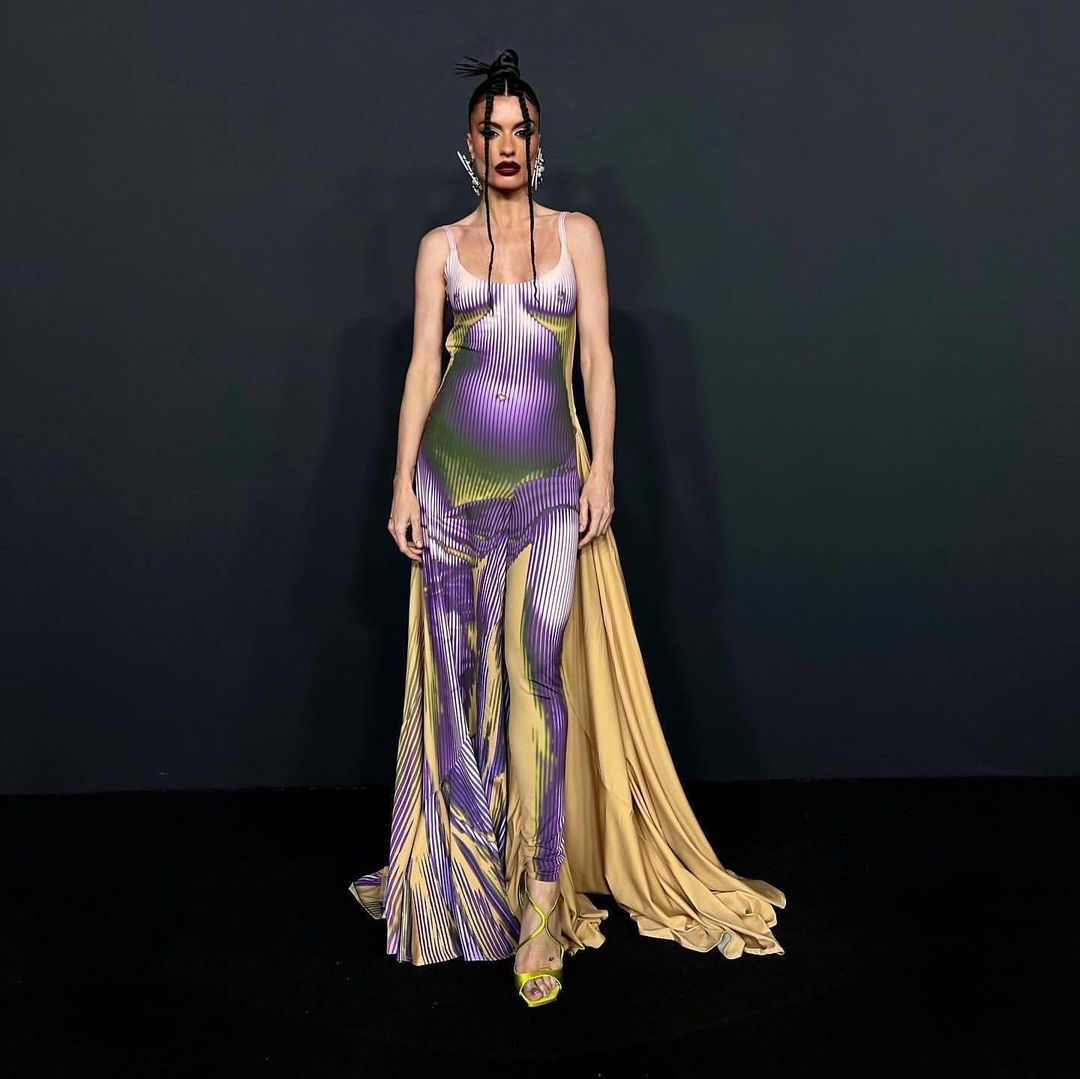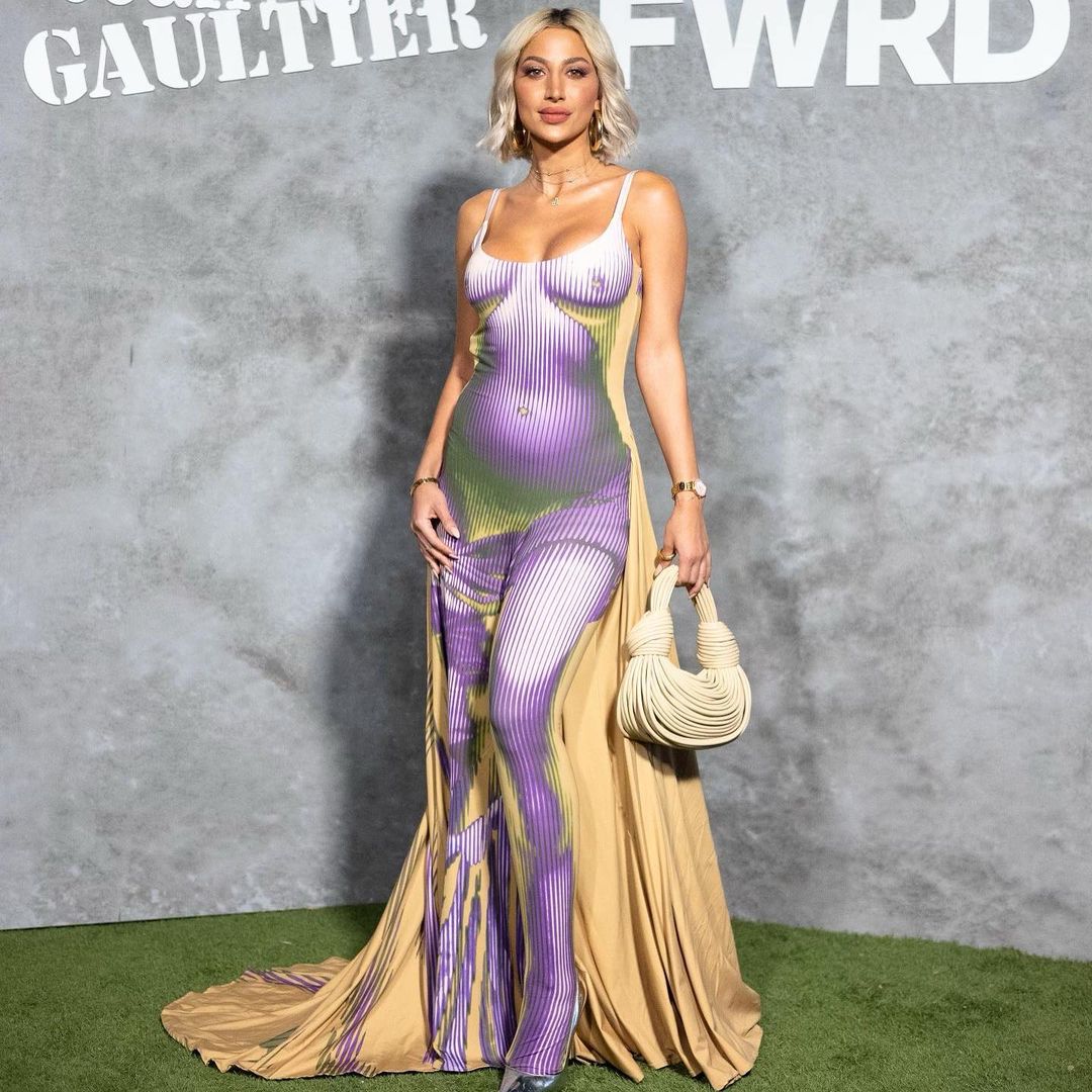While Yung Miami wore the look styled by Shaq Palmer with a yellow mini Hermes Kelly bag and lilac latex sandal heels, Model Roz and her stylist Mikiel Benyamin approached it differently, opting for silver Le Silla heels and a $2,345 Bottega Veneta purse to FWRD’s Jean Paul Gaultier launch.