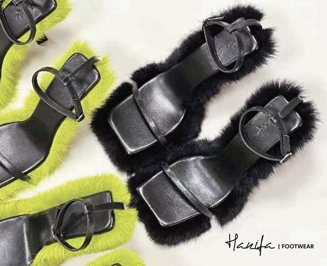 Just one amazing year later and Hanifa’s footwear line features 5 trendy styles including boots, mules and sandals with a mix of metallics, embellishments, luxurious leathers and furs.