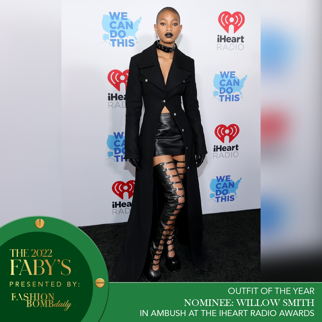 In March, Willow Smith slipped into all black everything for the iHeart Radio Awards. The full Ambush look, orchestrated by Chloe & Chenelle Delgadillo, featured a sweeping double-breasted coat, a leather miniskirt, leather thigh-high buckle platform boots, leather gloves and a spiked collar choker as the finishing touches. Punk looks good on Willow!