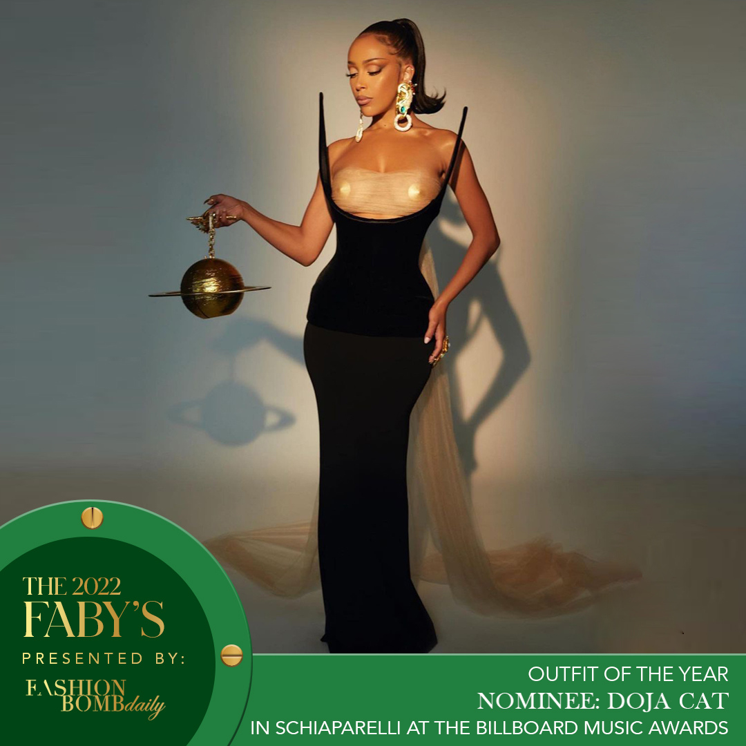 Doja Cat wore Schiaparelli Fall-Winter 2022 Couture to the 2022 Billboard Music Awards. Stylist Brett Alan Nelson added rings by Bijules Jewelry and pasties by Agent Provocateur. The look suited her quirky style to perfection and, for that reason, it was a total fan favorite!