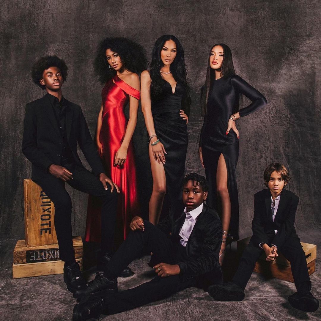 Kimora posed with her children Aoki, Kenzo, Ming, Gary and Wolfe, with herself in red and the kids in black for their family New Year’s card!