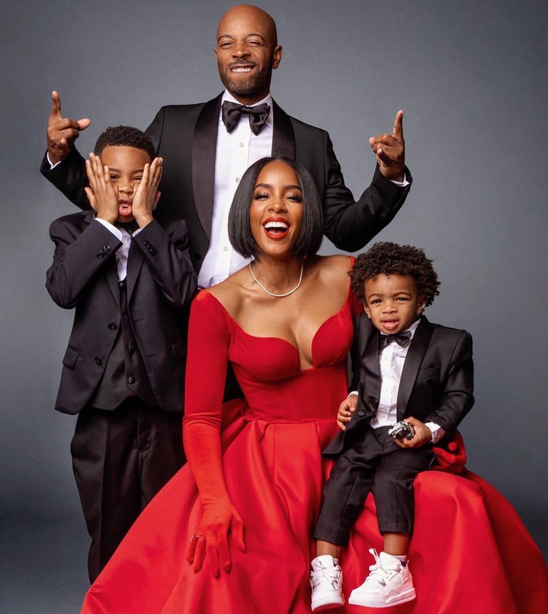 Kelly Rowland, husband Tim and their two kids Titan and Noah wished the world a happy holidays and prosperous year ahead with the boys matching dad in classic black suiting and mom in a red gown with a sculpted neckline and gloved sleeves.