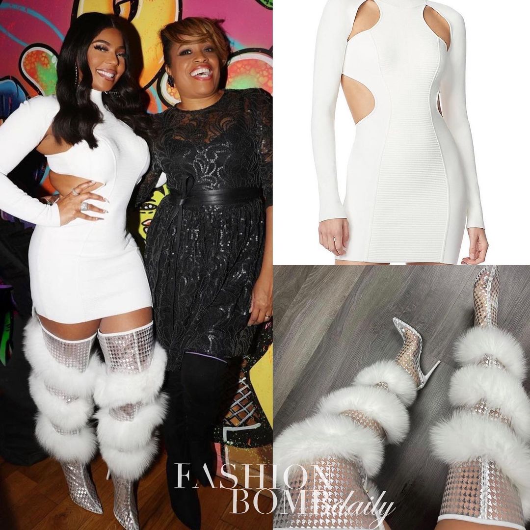 Ashanti spent the holidays with friends and family wearing a $1,190 Herve Leger cut out dress, currently on sale at SSENSE, and $1,150 Jennifer Le boots, styled by Tim B.