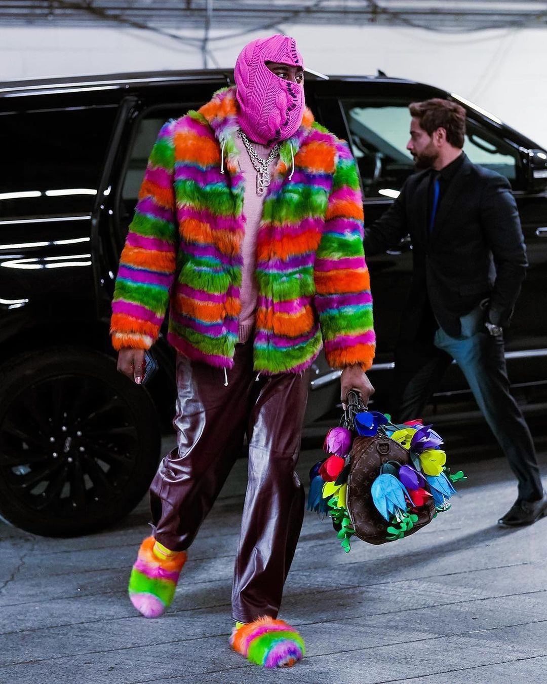 We’ve got tunnel vision for James Harden‘s tunnel fashion. Over the holidays, the NBA style star arrived to Madison Square Garden dressed winter weather appropriate with a clear statement that he’s ready for the spring! From top to bottom, Harden wore Marni, including a wool Balaclava that’s currently available at SSENSE for $257, a $6,700 striped shearling hoodie, light Nappa leather cargo pants for $1,614 and a pair of $1,050 faux fur slippers.