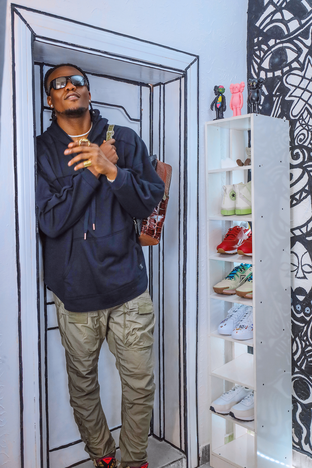 A beautiful day in Lekki, Lagos, Nigeria and we are preparing the creative space for the arrival of Pheelz. We wanted to make sure he felt the artistic energy and freedom when he is shooting. Pheelz arrived and Designer Tasha walks him through his wardrobe and shows him his custom pieces of apparel with his artwork on it. Pheelz then offered up a huge hug & smile. All of his clothing were made custom by Nigerian designers and we even had some custom sneakers done for him. Pheelz is not only a phenomenal producer and music artist, he is also a creative artist and has astonishing artwork. We want you to dive into this interview and get all of the questions answered that you had about Pheelz, because we are definitely catching PHEELZ…