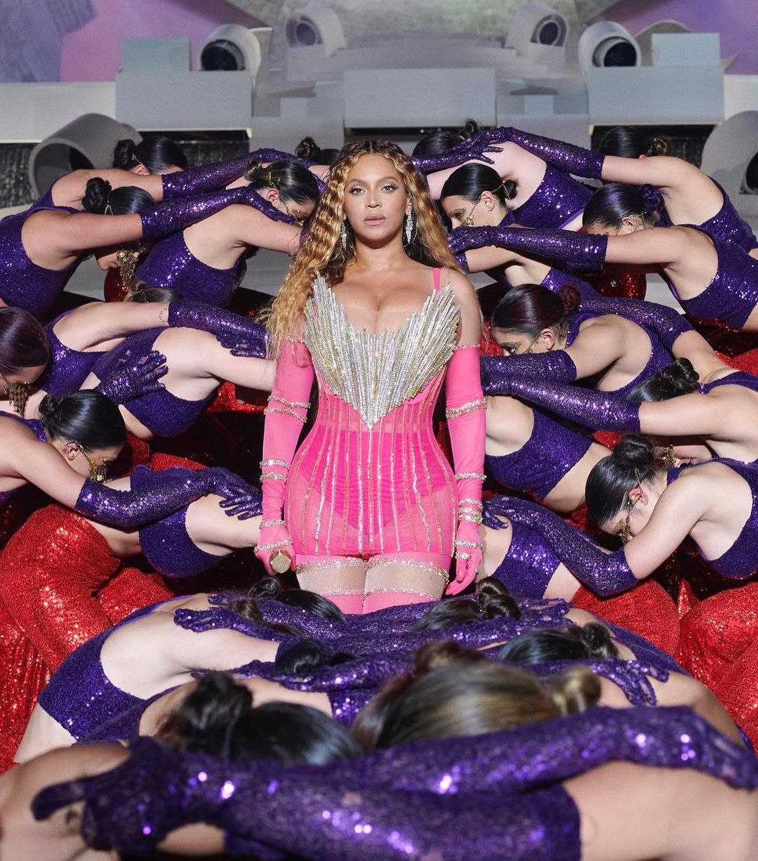 Barbiecore may be slowly phasing out, but that didn’t stop Bey from wearing this pink-on-pink custom creation. Silver and gold sparkled as accents on her Valentino pink corset mini dress, tights, and sheer gloves.