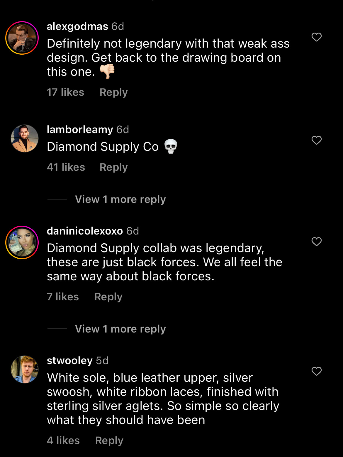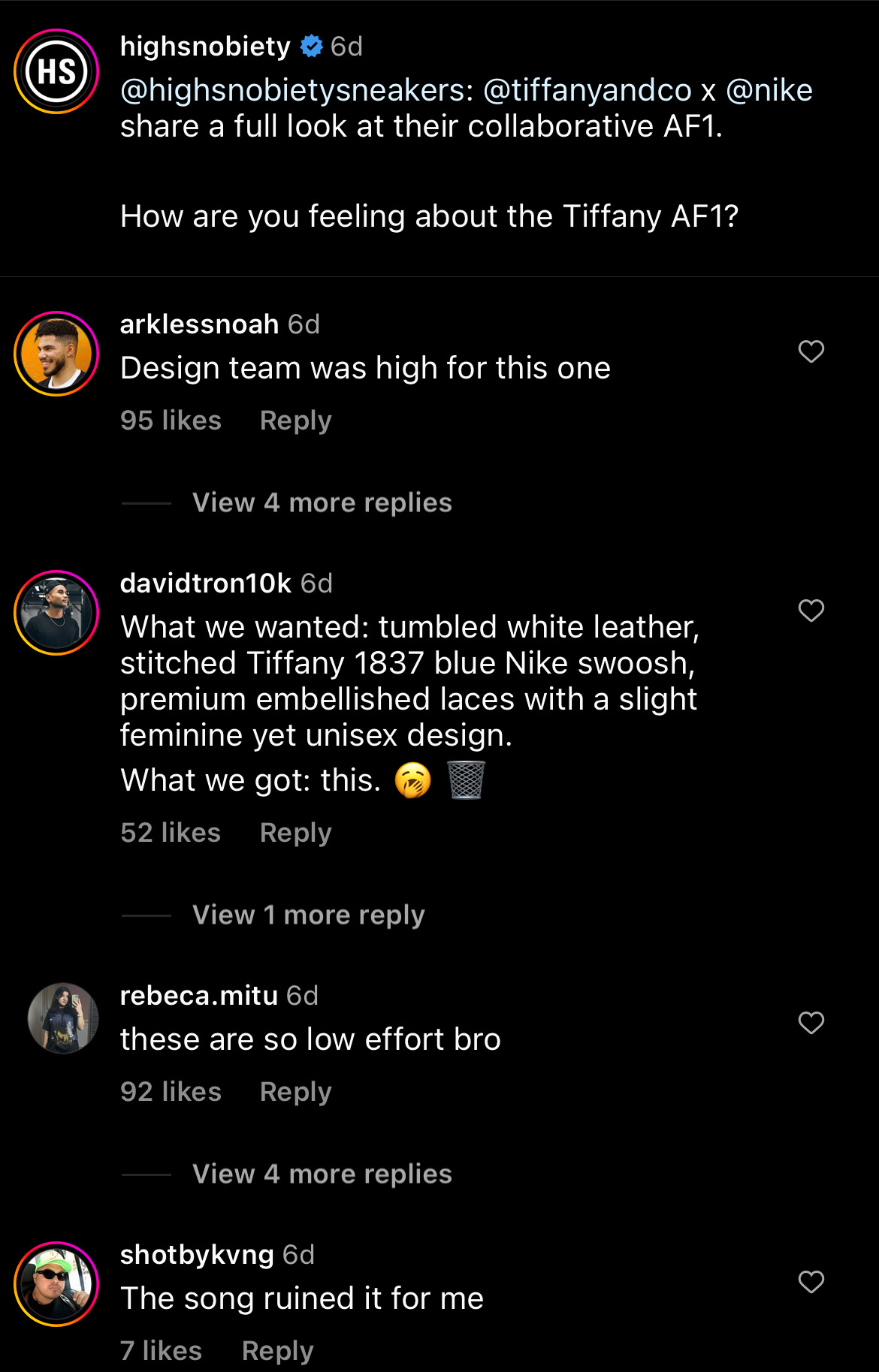 Although the ‘Tiffany Dunk’ is unofficially sanctioned by Tiffany, this design provided sneaker fans enough contrast to deem the Nike & Tiffany shoe low-effort. As soon as images of the shoe hit the net, people were not shy to share their disappointment.