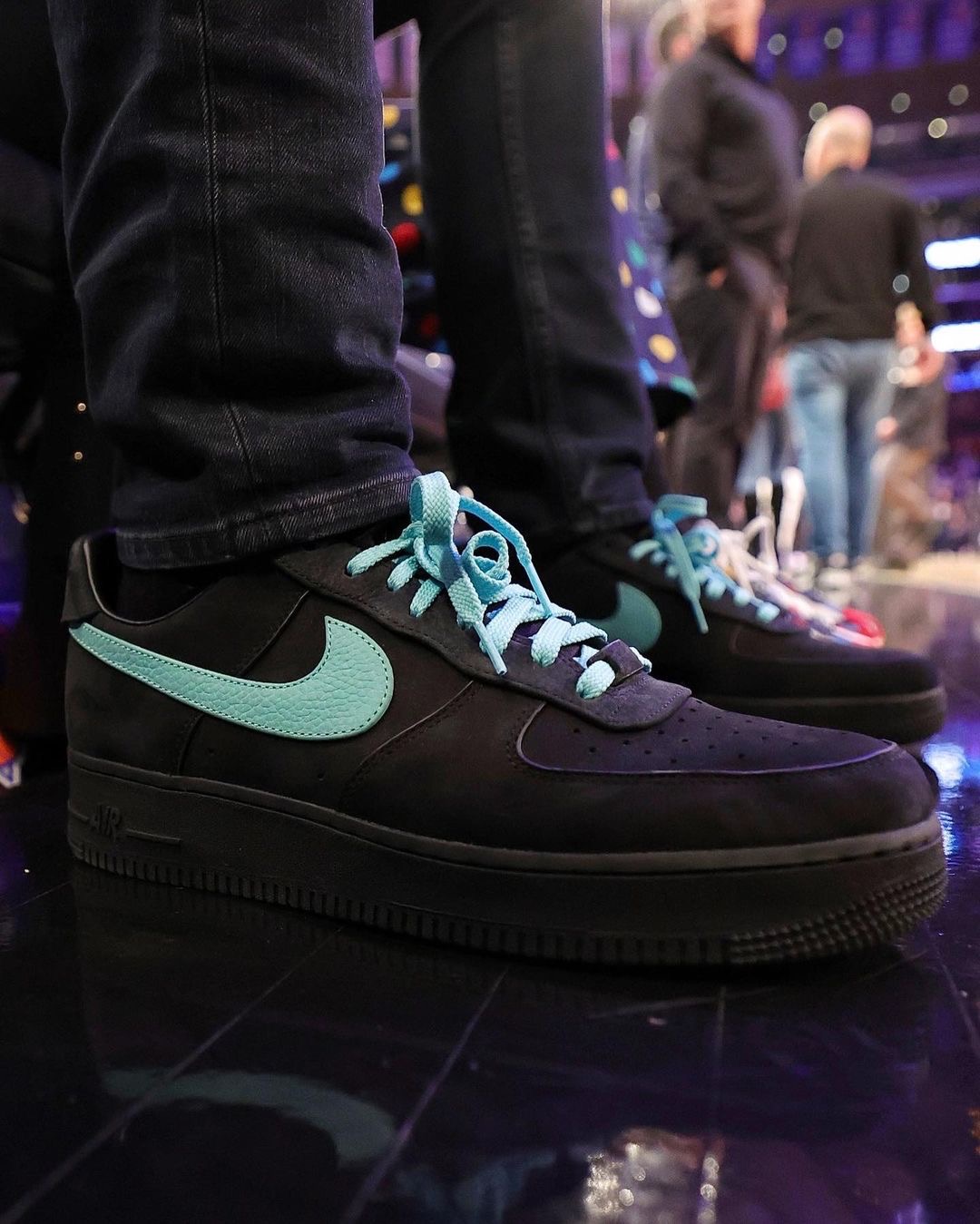 While sitting courtside at a New York Knicks game, Arnault wore the Nike & Tiffany Air Force 1 with black skinny jeans, a black button-up t-shirt, and the Sapphire Rainbow Murakami Hublot watch. A sleek and minimal look for a minimally designed shoe.