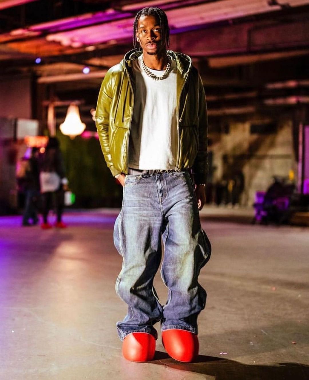 The NBA tunnel has become a platform for style, and Gilgeous-Alexander is one of the most uniquely dressed stars in the league. While walking the tunnel before playing against the Lakers, he wore the Big Red Boots with the Loewe nappa leather zip-up hoodie and the Louis Vuitton washed wavy denim.