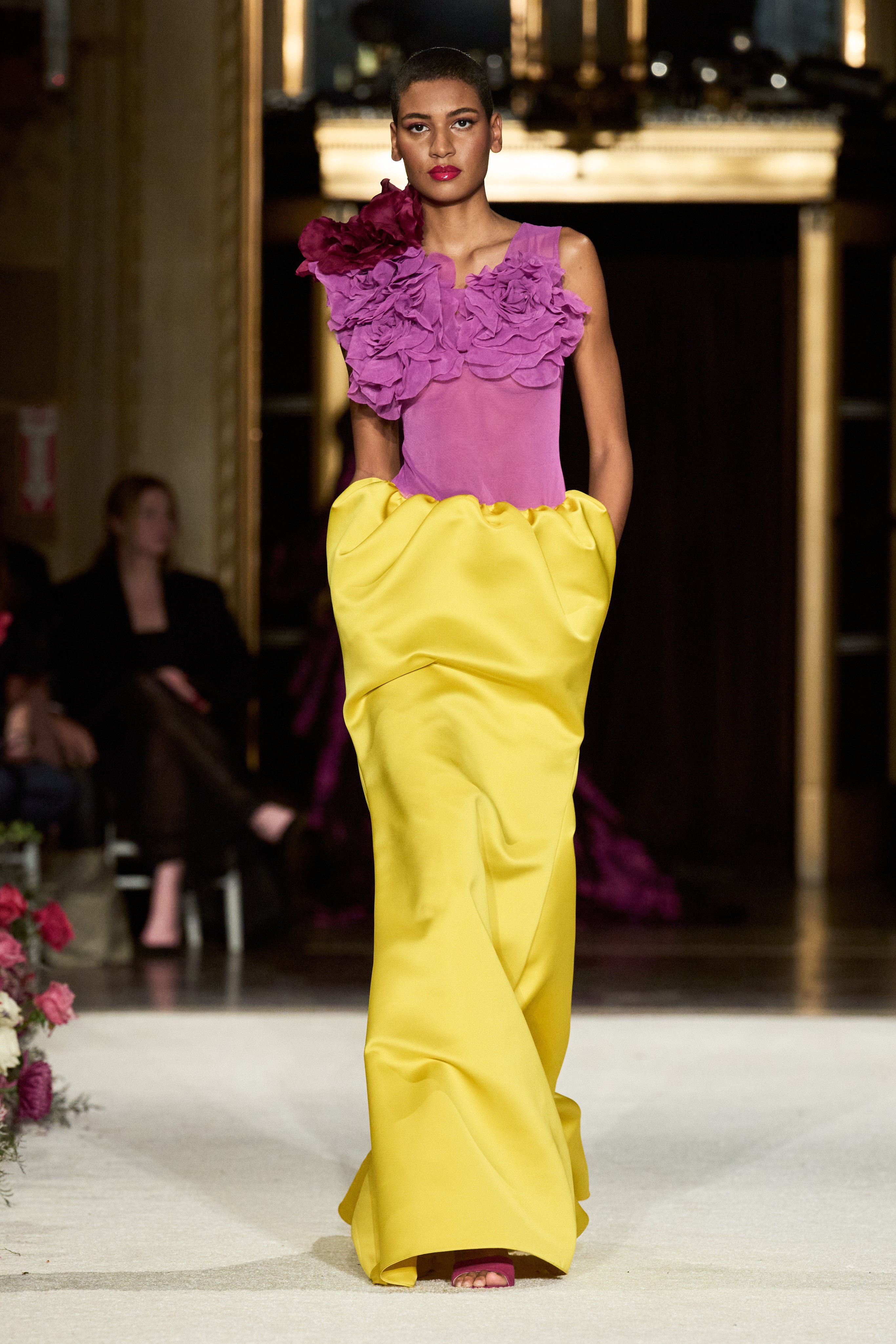 On the runway, models like Ya Jagne, Jocelyn Corona, and Coco Rocha dawned designs that also spoke to the garden theme. As oversize floral decals continue to trend upward, Siriano grabs hold of the latest fashion and delicately sprinkles it throughout his collection. The blooming decal adorns dress hems, tailored sleeves, gloves, and midriff cut-outs. Black and white take hold of this collection, outfitted in several red carpet-worthy offerings, but golden yellows and magenta tones create the right pop for a fall/winter collection.