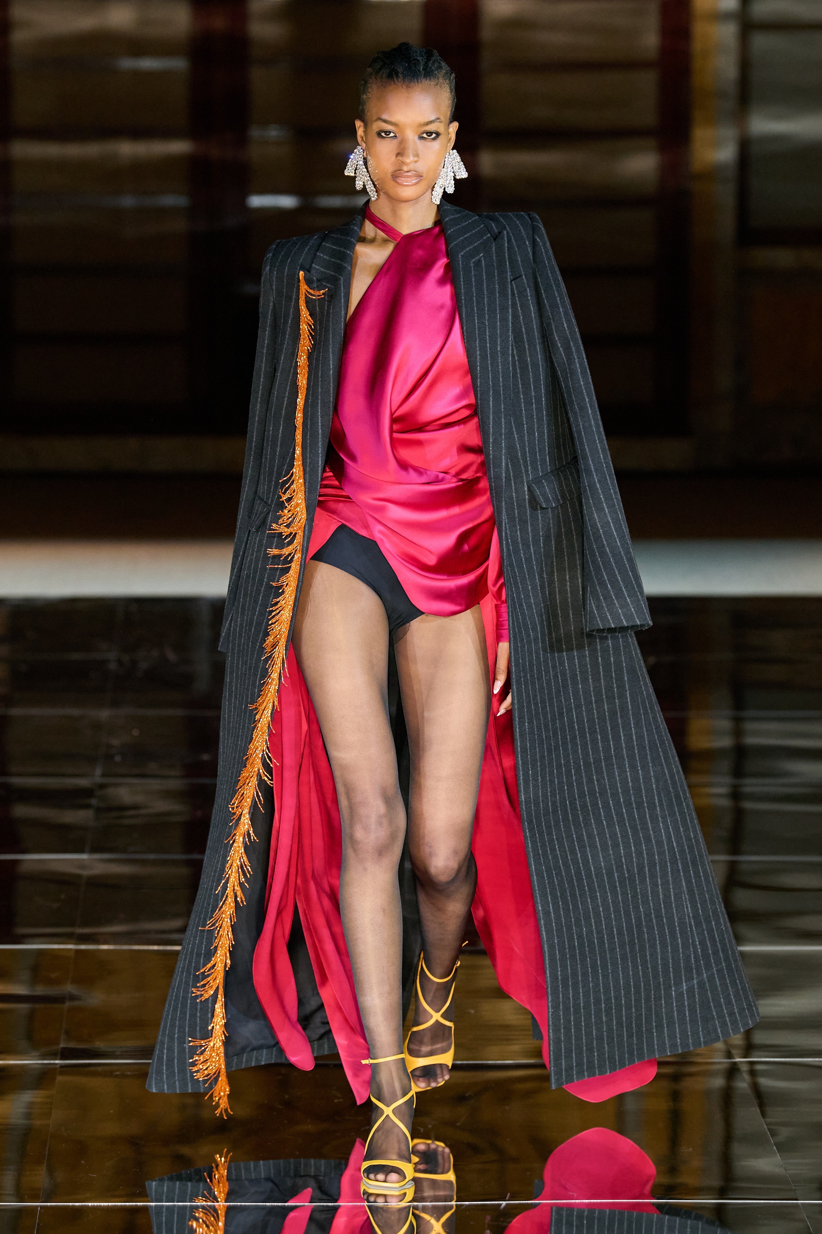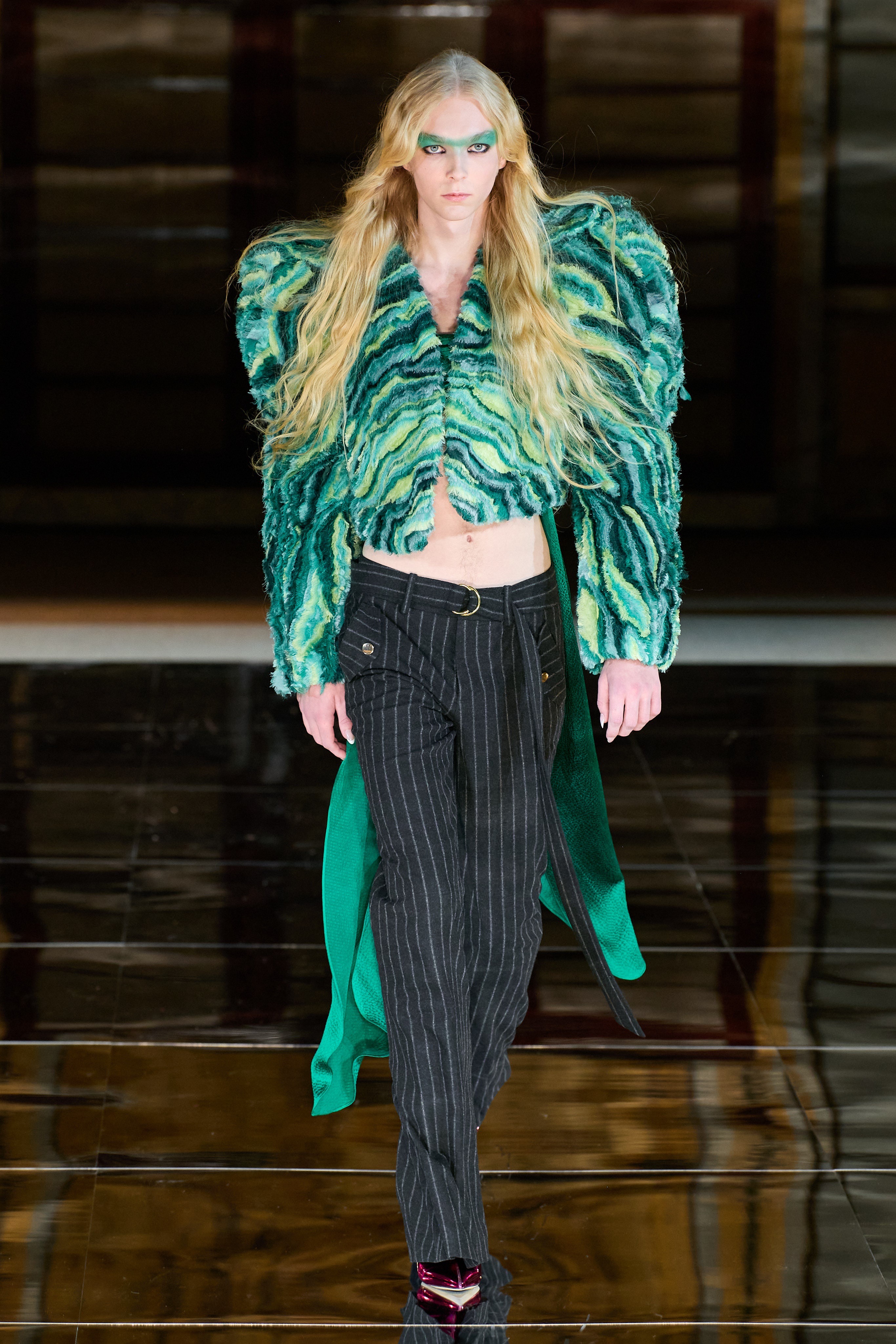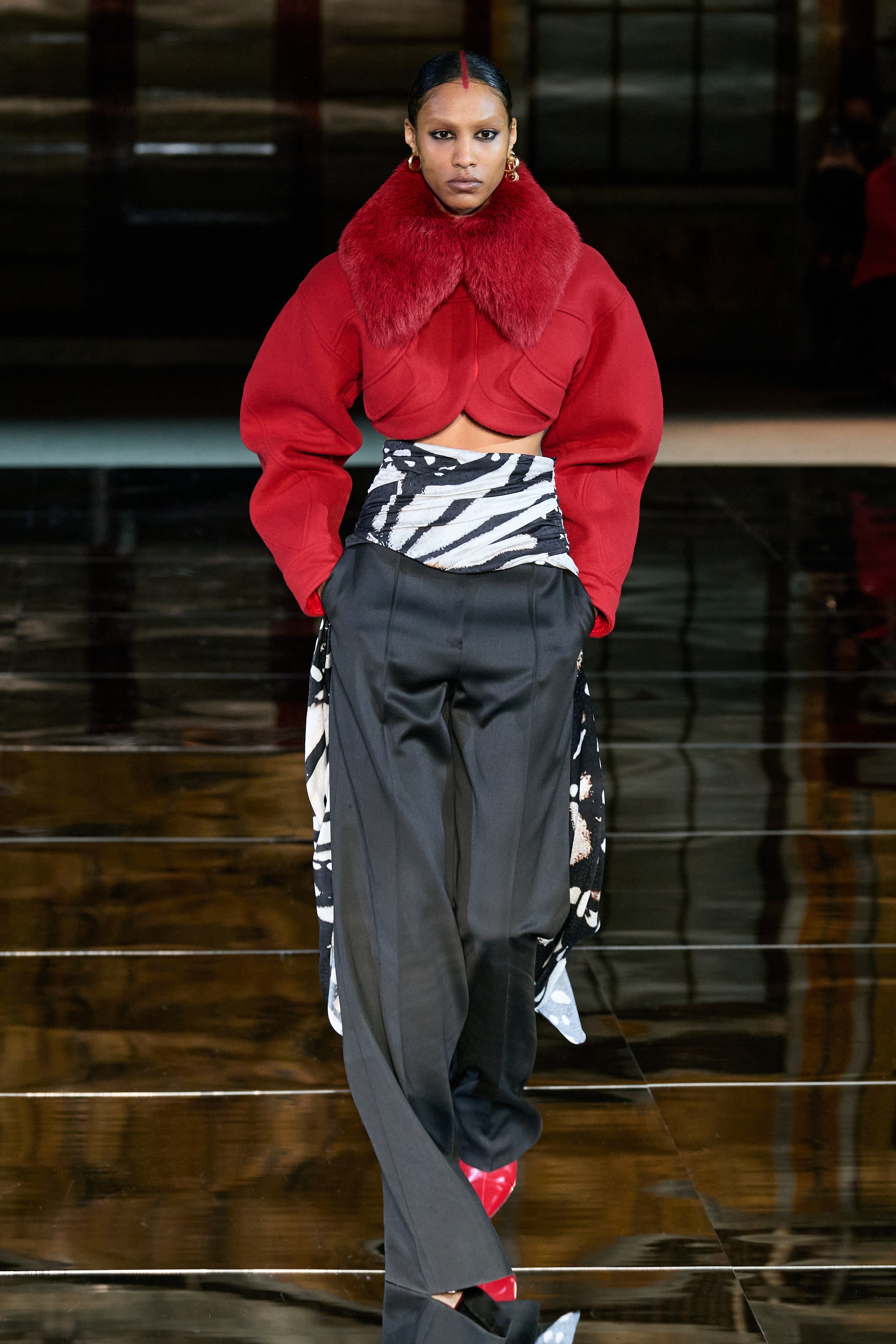 Elsewhere, tailoring is bold-shouldered and sharp. Bold also speaks to the color story of this lineup. Vibrancy is varied and not spared even for an evening. Gurung embraces the trending pantless look and pairs it with one of the many fun outerwear pieces. The outerwear ranges in classic patterns with playful updates and cropped saturated furs.