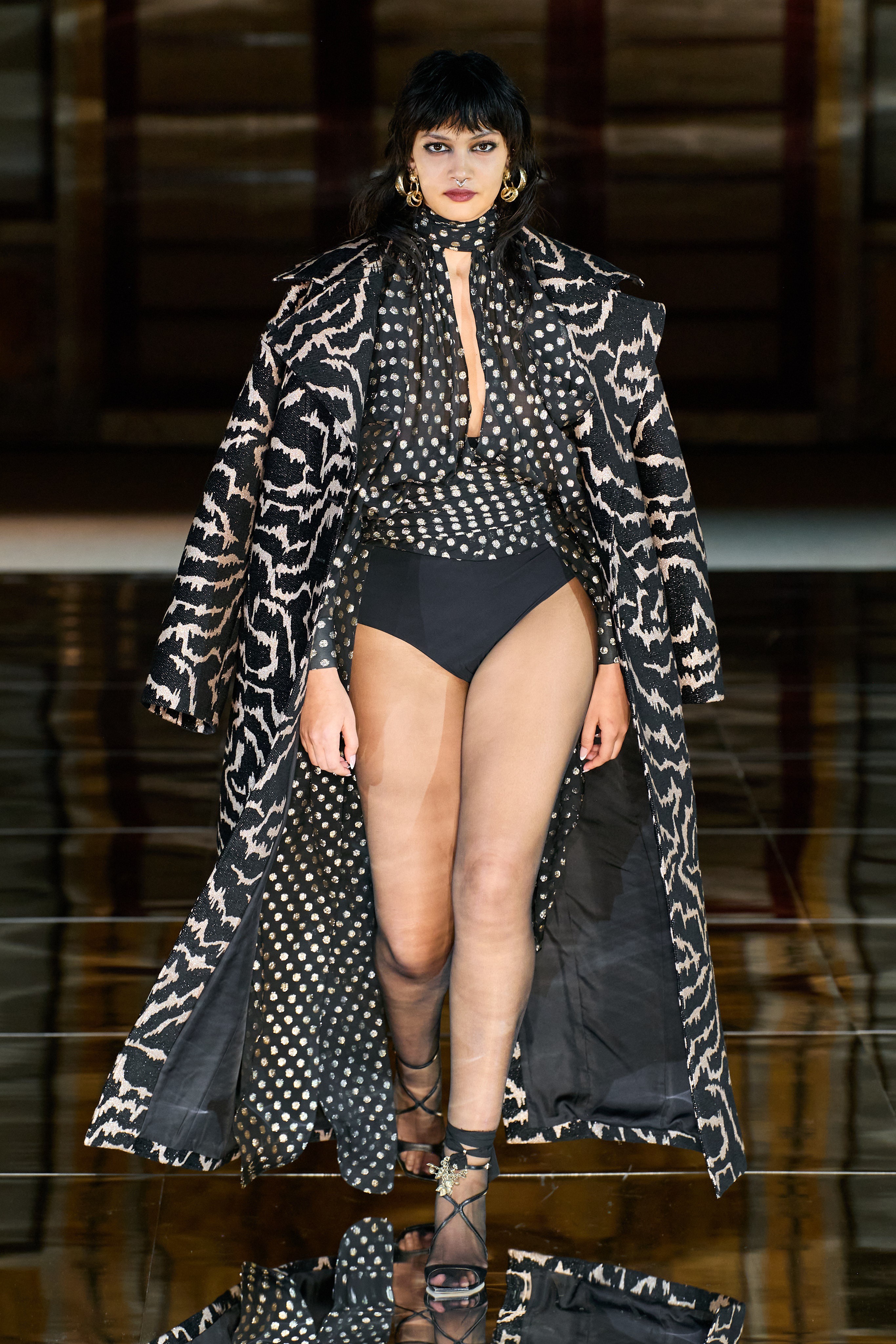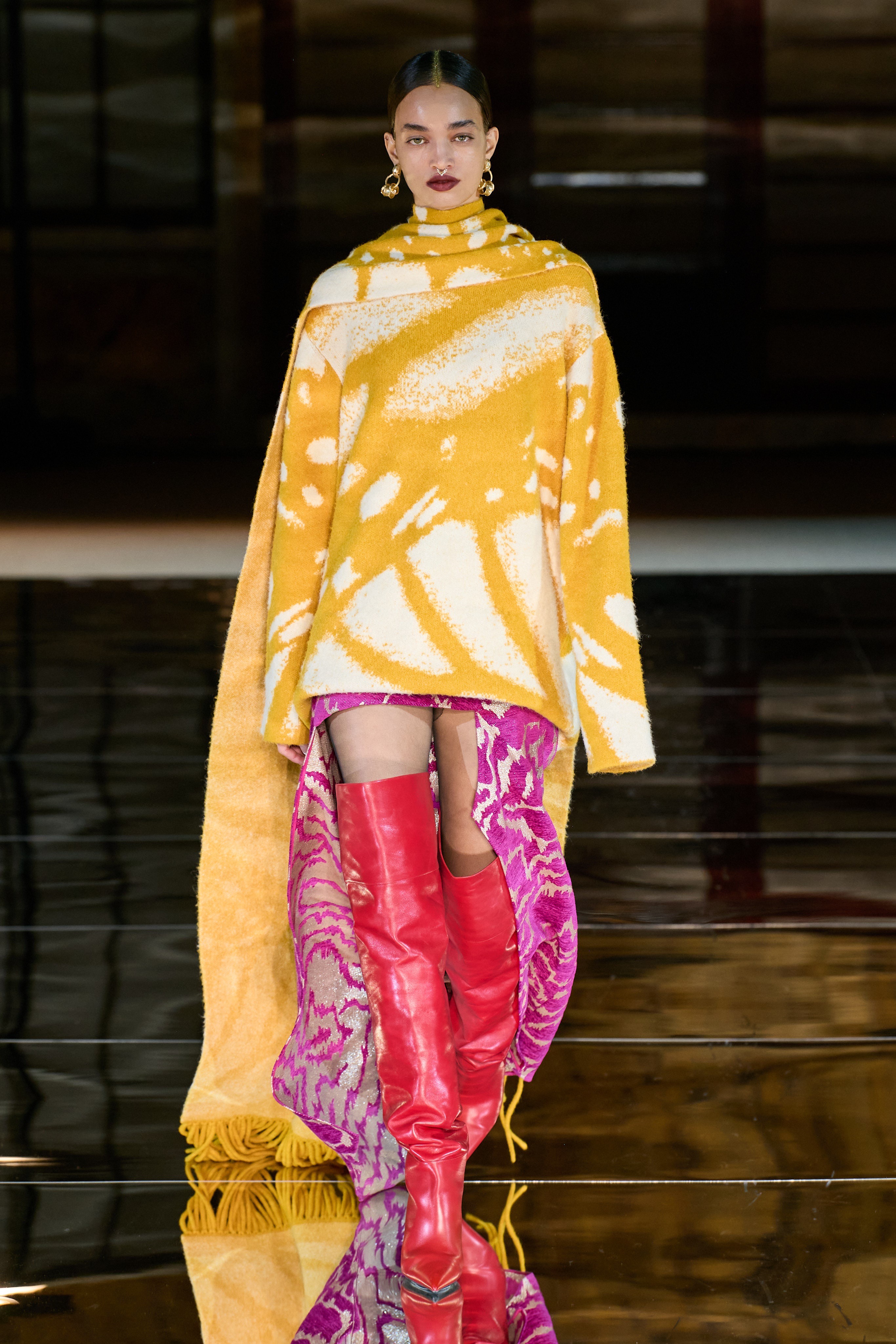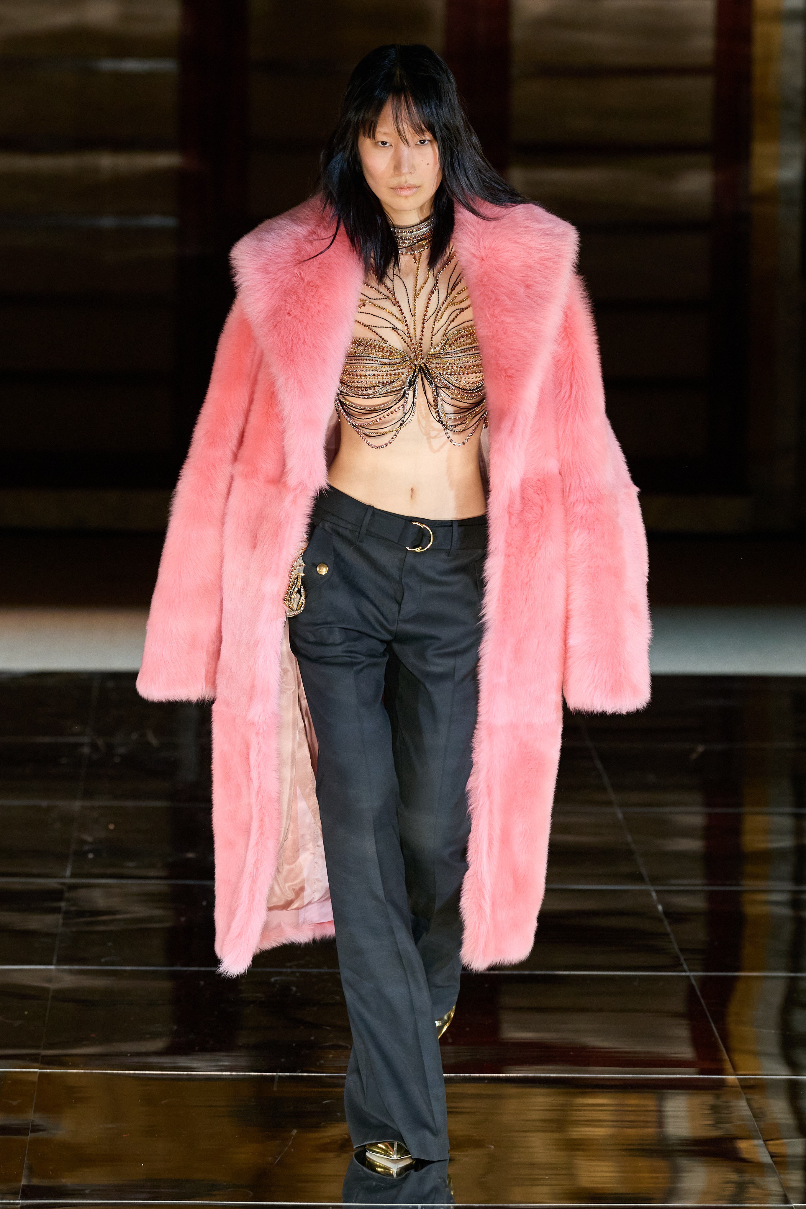 Elsewhere, tailoring is bold-shouldered and sharp. Bold also speaks to the color story of this lineup. Vibrancy is varied and not spared even for an evening. Gurung embraces the trending pantless look and pairs it with one of the many fun outerwear pieces. The outerwear ranges in classic patterns with playful updates and cropped saturated furs.