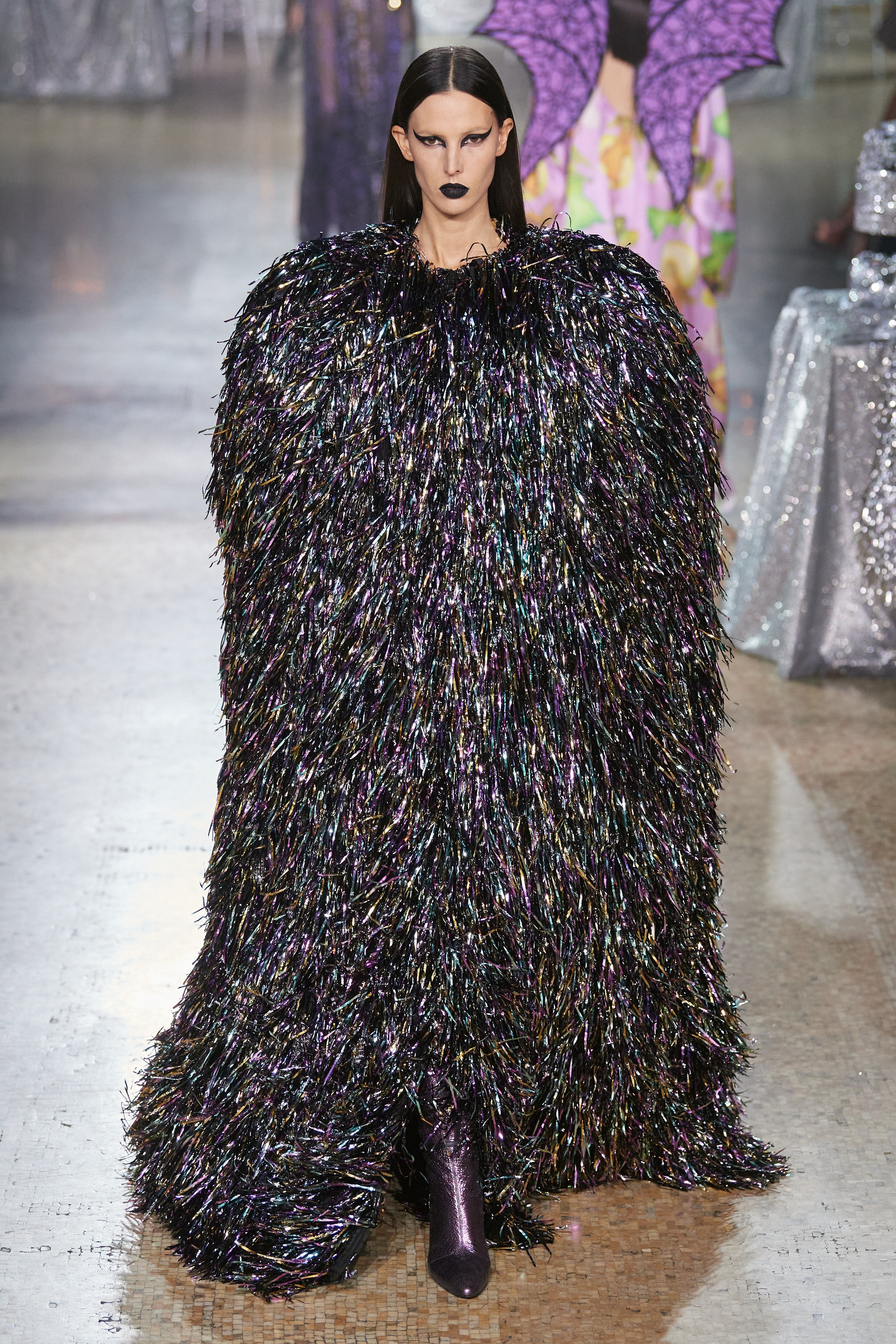 The collection was already a spectacle, but the real drama came when over-the-top metallic fringe made its way down the runway in the shape of bold shoulder gowns and glamorous cape coats.