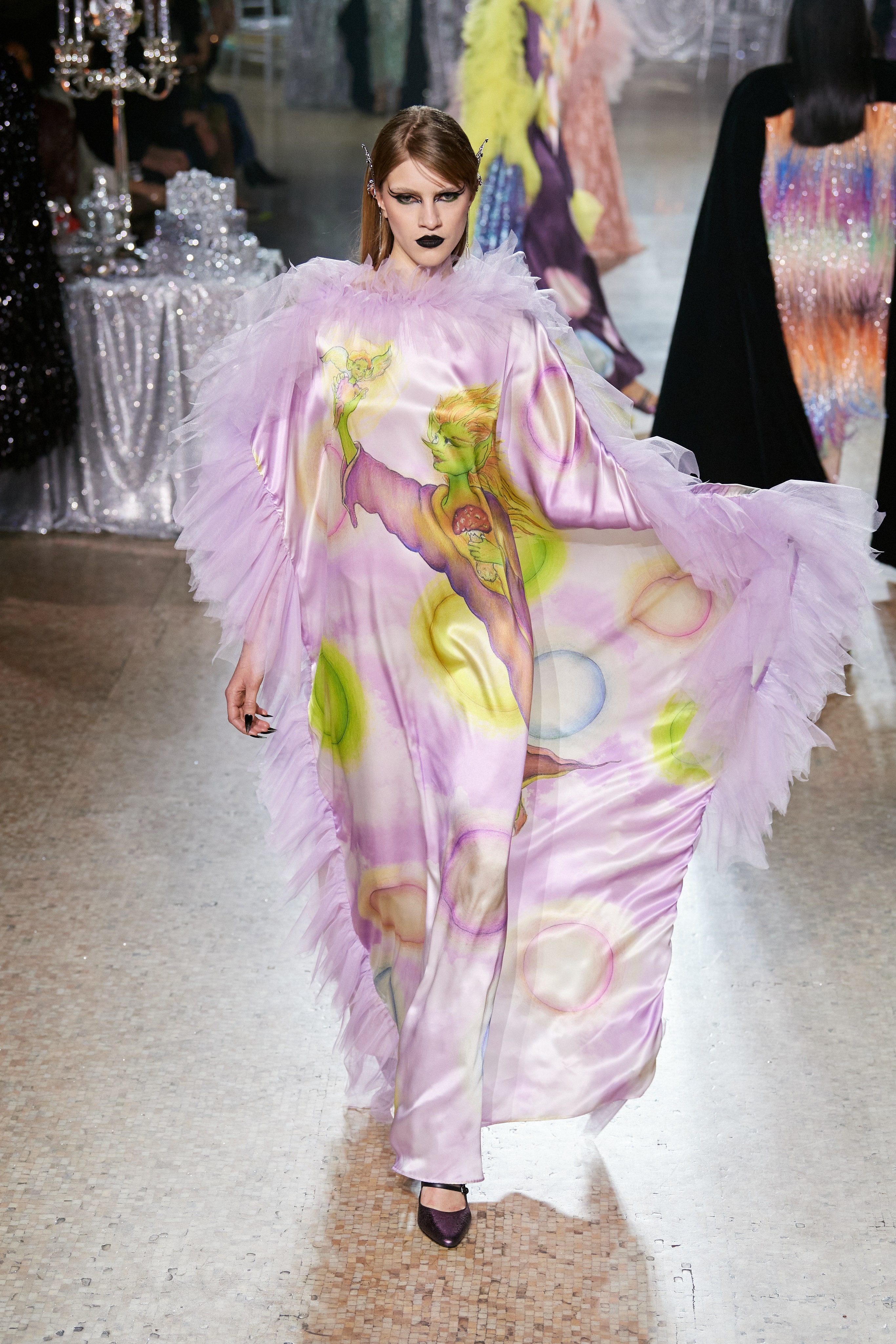 Black V-shaped lace insets, mutton, sleeves, and double-breasted wool coats, touch on a Victorian feel, while beaded slip dresses and full tulle robes speak to an Old Hollywood glam.