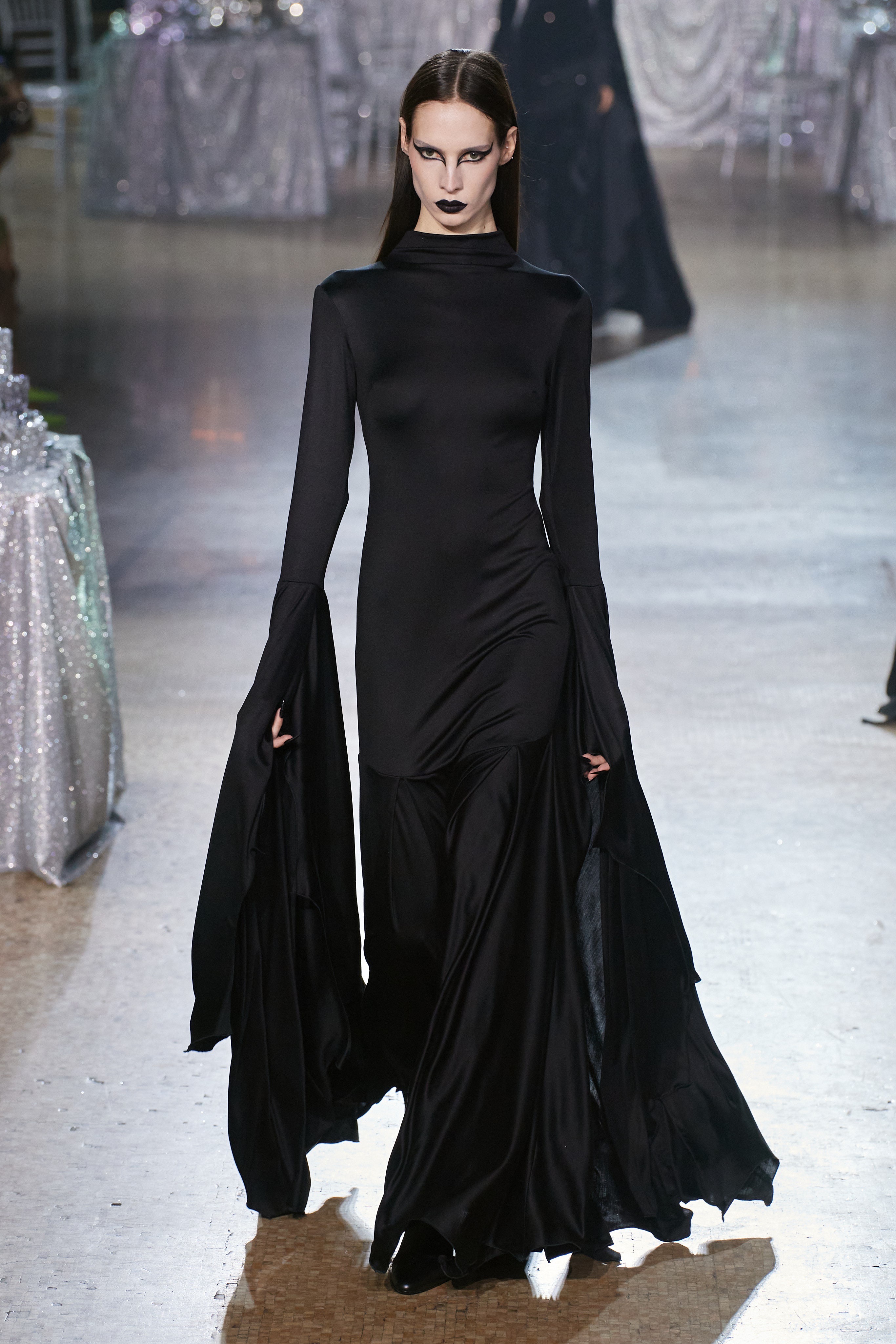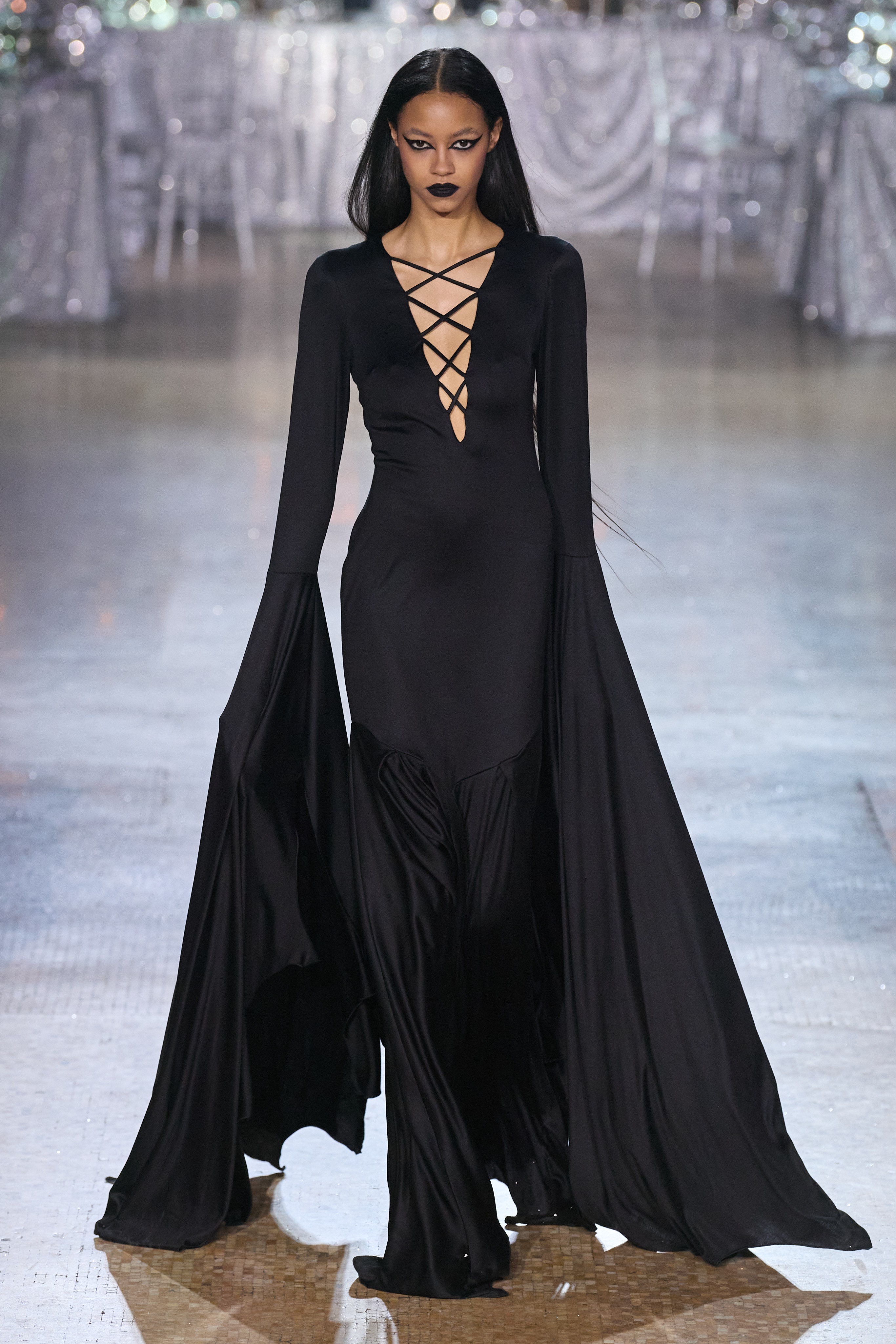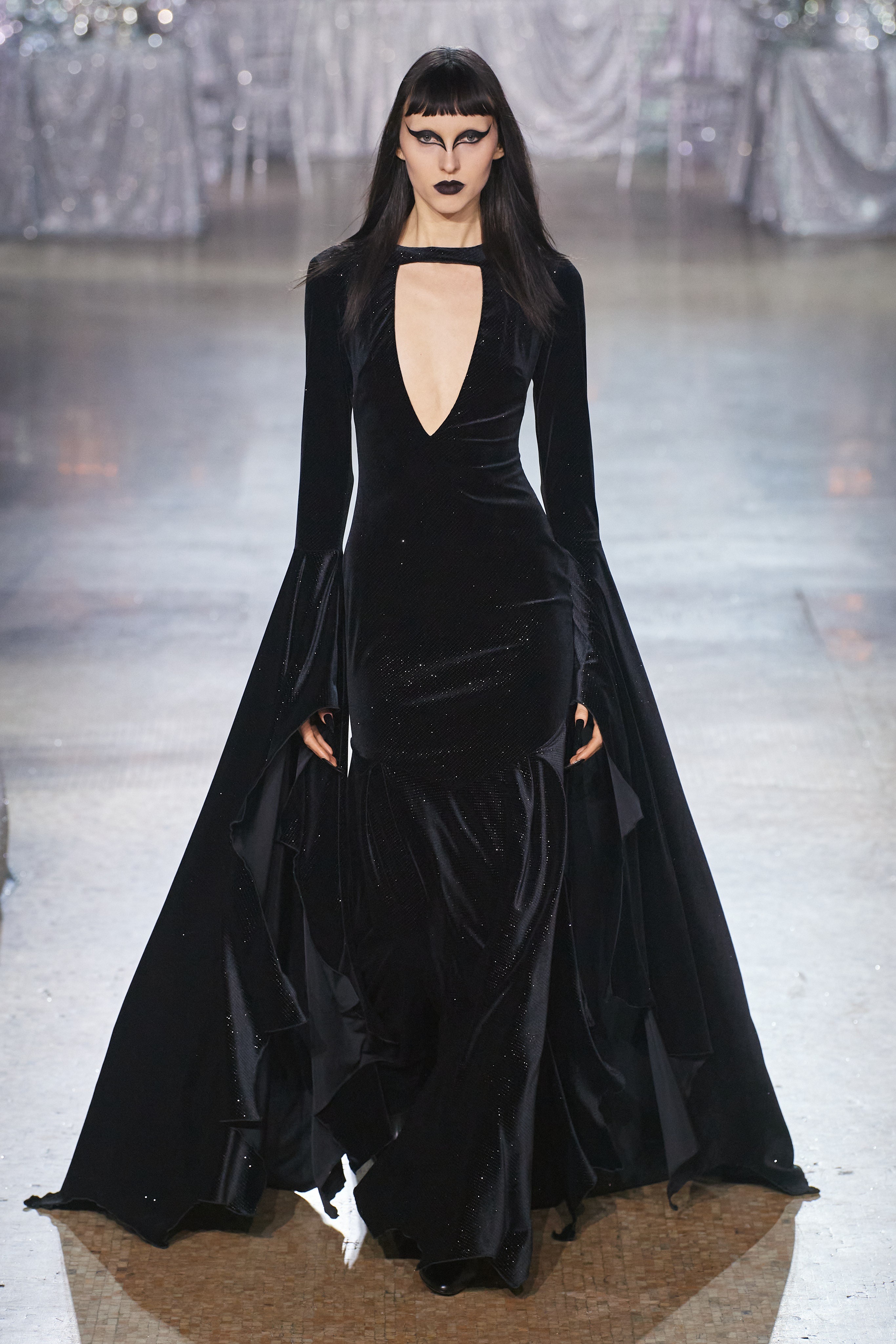 But this isn’t a collection for just any kind of fairy. This lineup speaks to the dark and gothy. Each model strutted the runway in dark eye makeup and black lipstick. Black gowns in jersey and velvet opened the show, each with bell sleeves so dramatic they swept the runway with each stride.