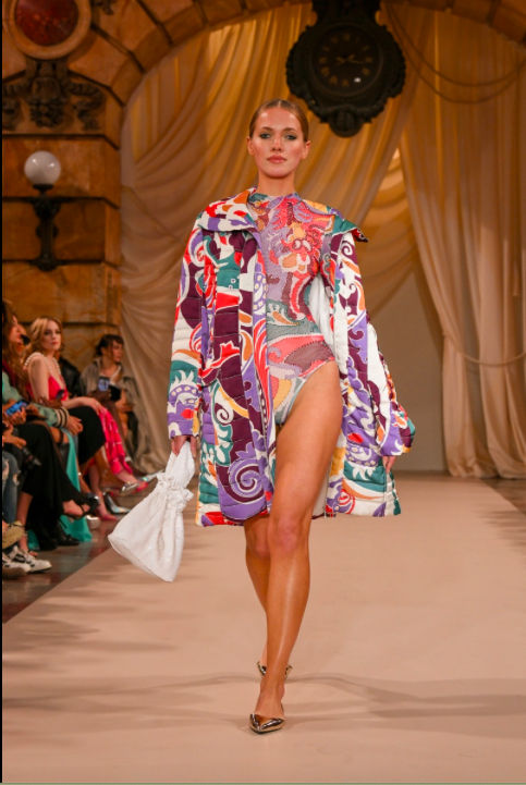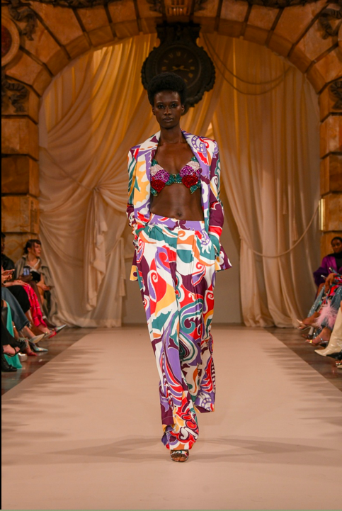 Bonaldi incorporated bedazzled bralettes and bandeau tops throughout her signified looks with pants and layered skirt completions that came in several silhouettes. Her outstanding use and implementation of multicolored beading at the hemlines of some of her garments demonstrates how Bonaldi’s talent has only elevated since the inception of PatBo.