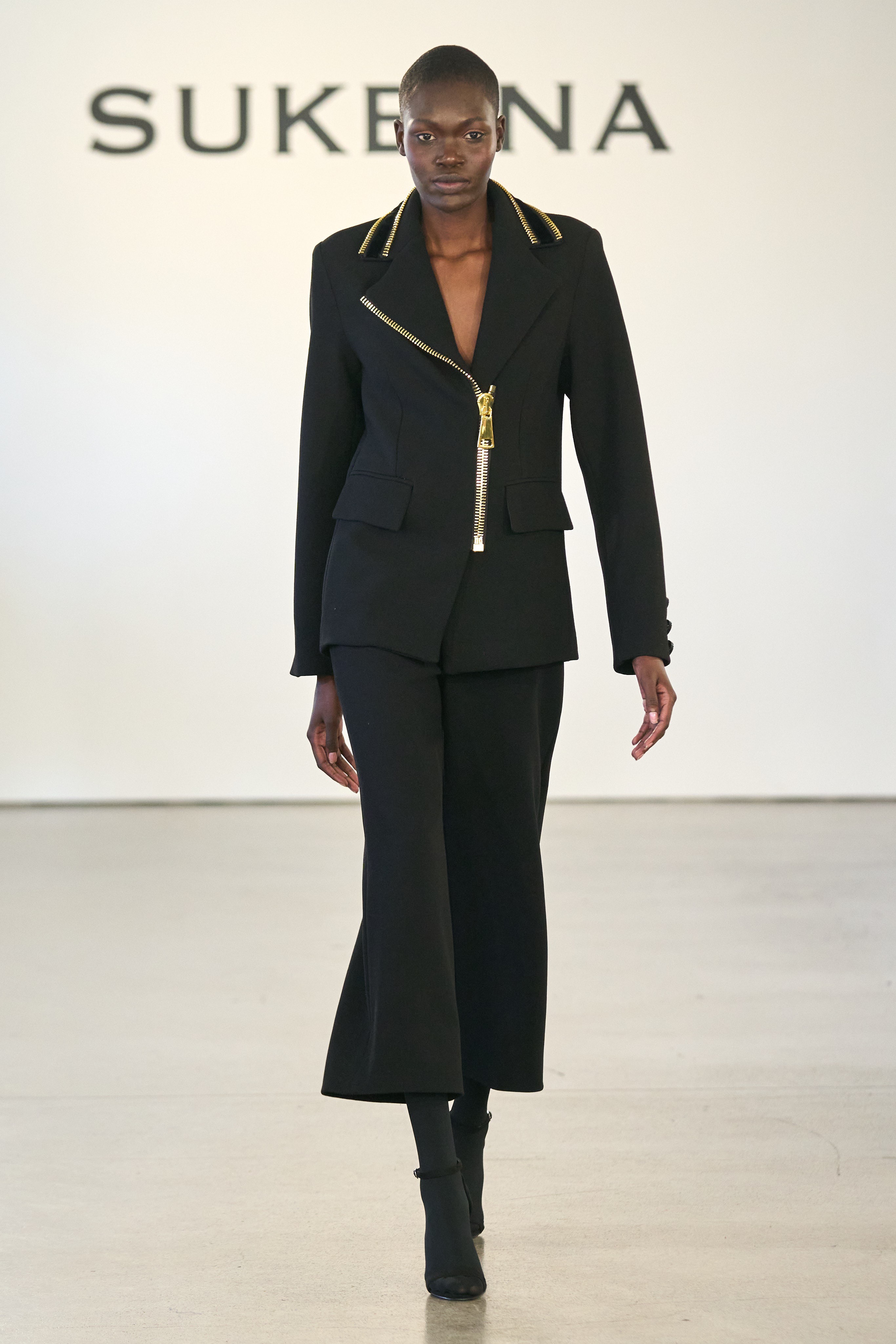 This season, Salam toyed with the idea of perception. What does the Sukeina woman say to the world, and how does she frame these statements? In a world so driven by social media and the constant oversharing of our lives, Salam used exposed zippers to represent the notion of access. The use of sharp tailoring in both suiting and outerwear speaks to the clarity of the Sukeina woman. She’s direct, she’s sleek, and undoubtedly knows how to dress.