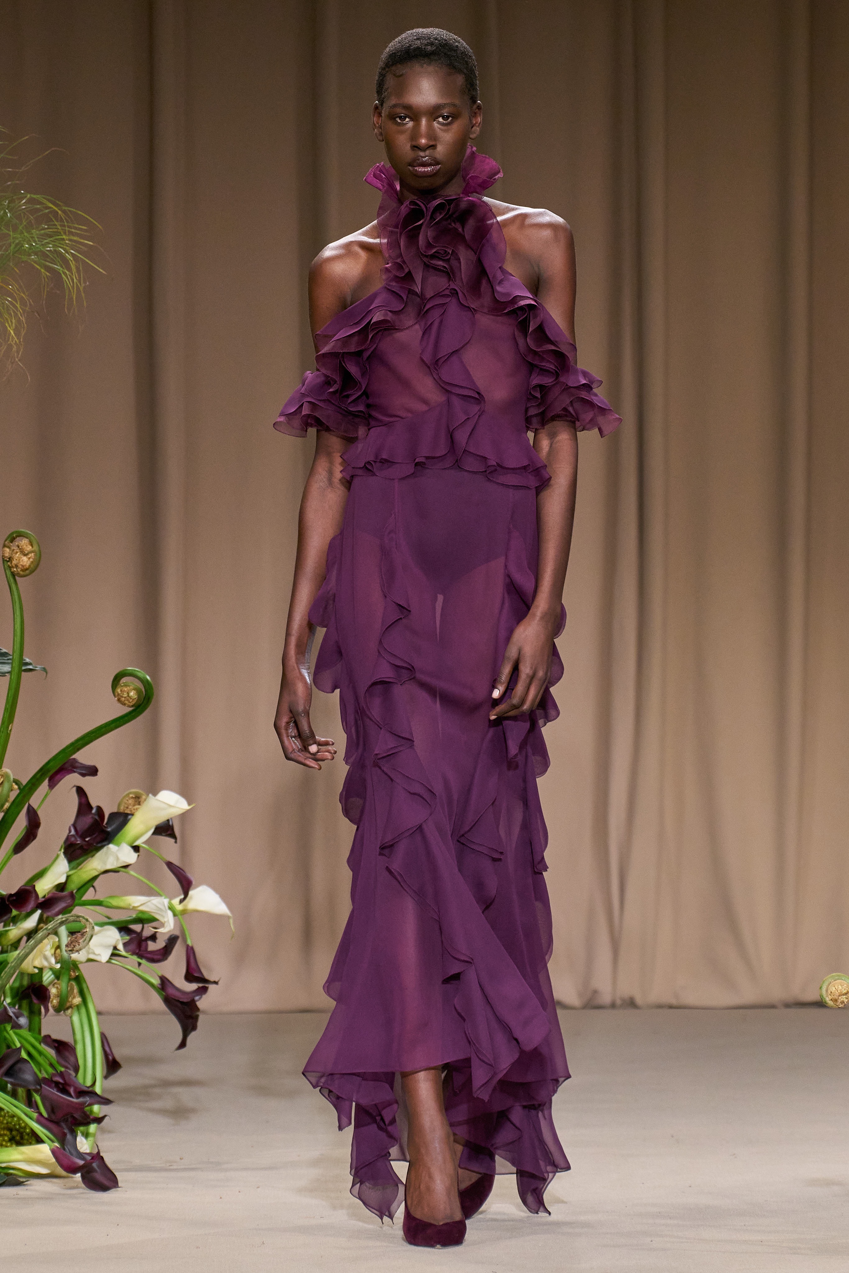 From onyx, nude, and rose-colored elaborate gowns, Wu showcased styles like blazer dresses with lace turtlenecks and ruffles down the seam, sheer see-through dresses with touches of fringe, and A-symmetrical dresses with peekaboo cutouts. His most notable design was a ruby halter top gown that flared beautifully from behind.