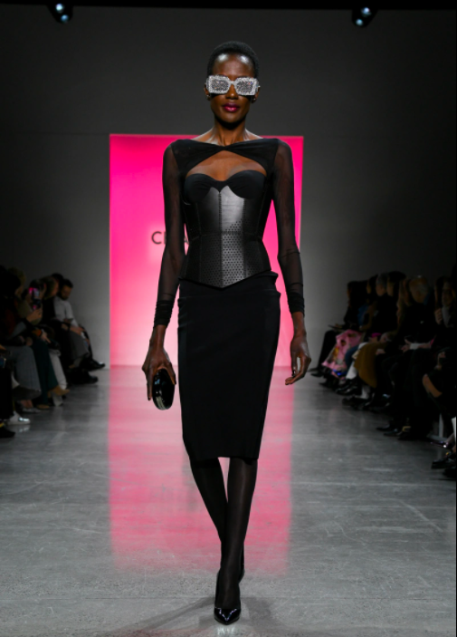 If you can reimagine the glasses that Beyonce rocked in her DIVA video, you can envision Boni chained sunglasses that she showcased with various runway looks. She also utilized long leather gloves, choker necklaces, and clutches.