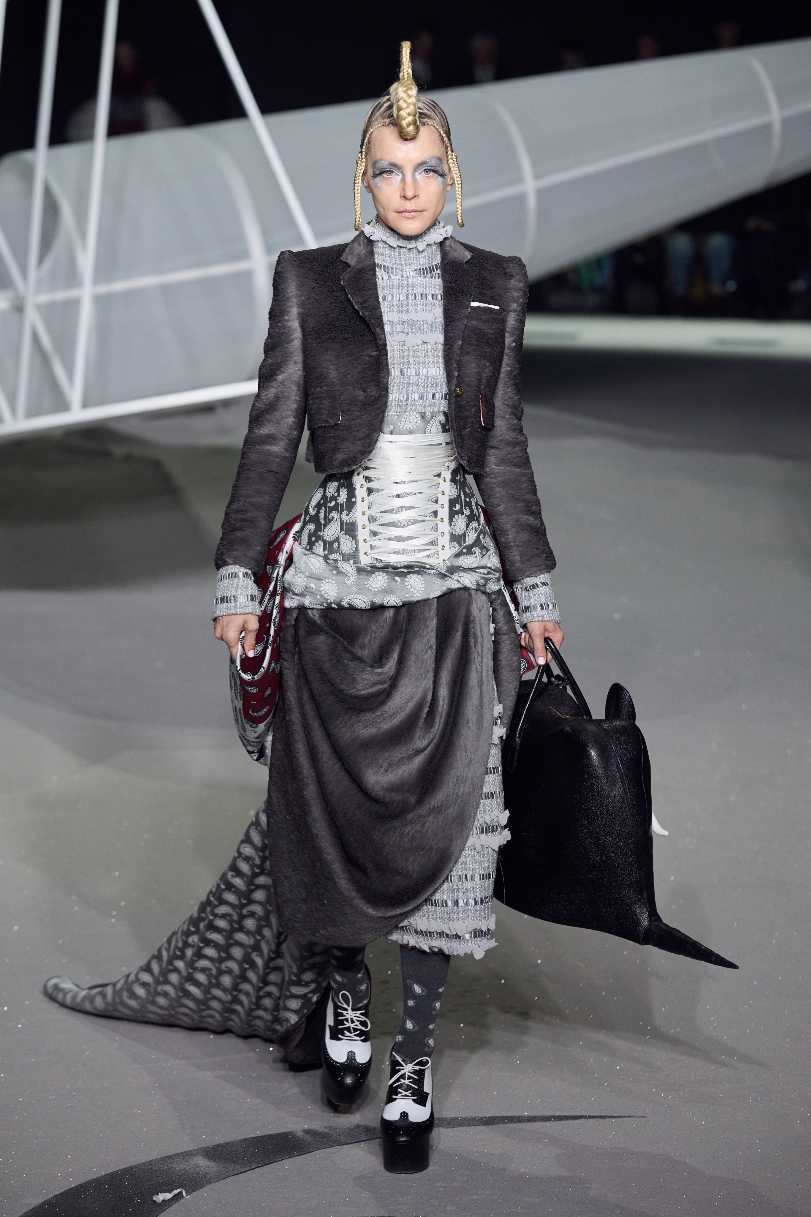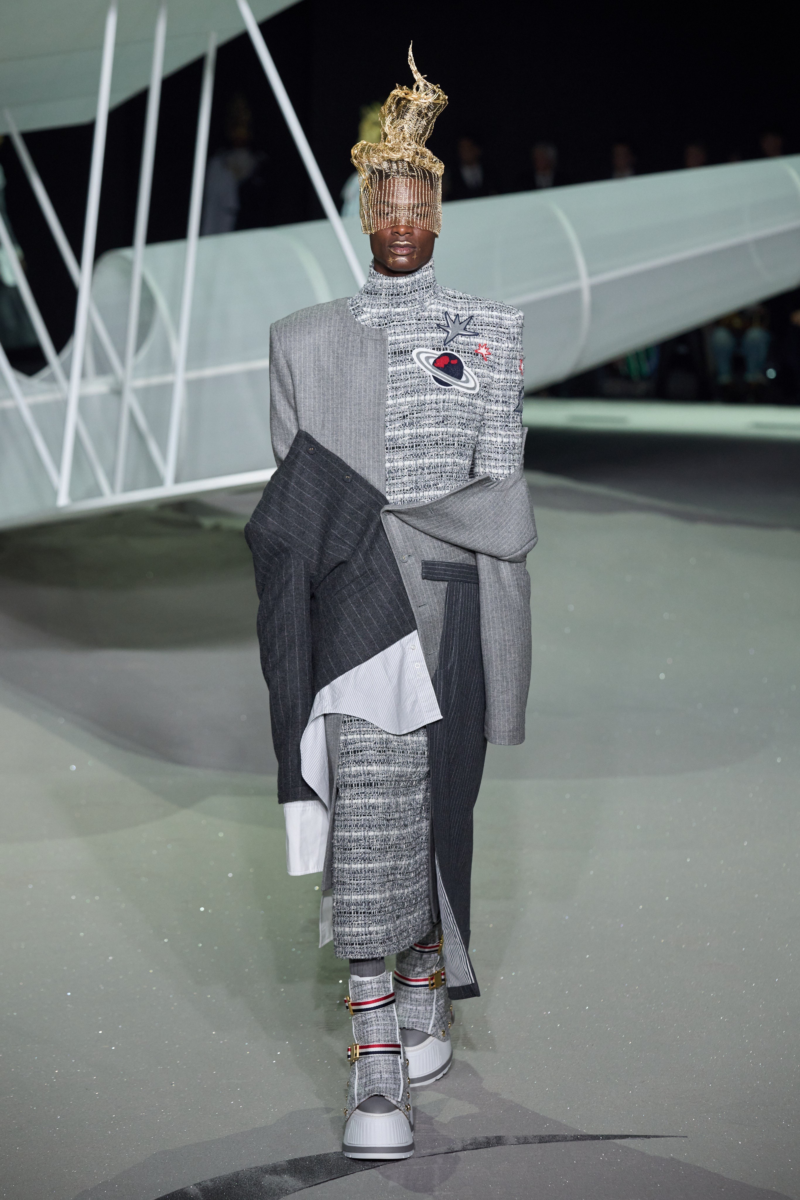 In addition to the dynamic planetary garments, we also saw Browne’s signature use of plaid. From plaid-on-plaid suiting to oversize plaid and tweed coats with shoulder pads, we saw what makes Thom Brown a maximalist of our time in the most endearing way. Multiple layers of black, gray, and red multicolored plaid blazers came in various variations, paired over white oxford shirts and ties. Browne completed looks with plaid trousers, pleated skirts, and Bermuda shorts.
