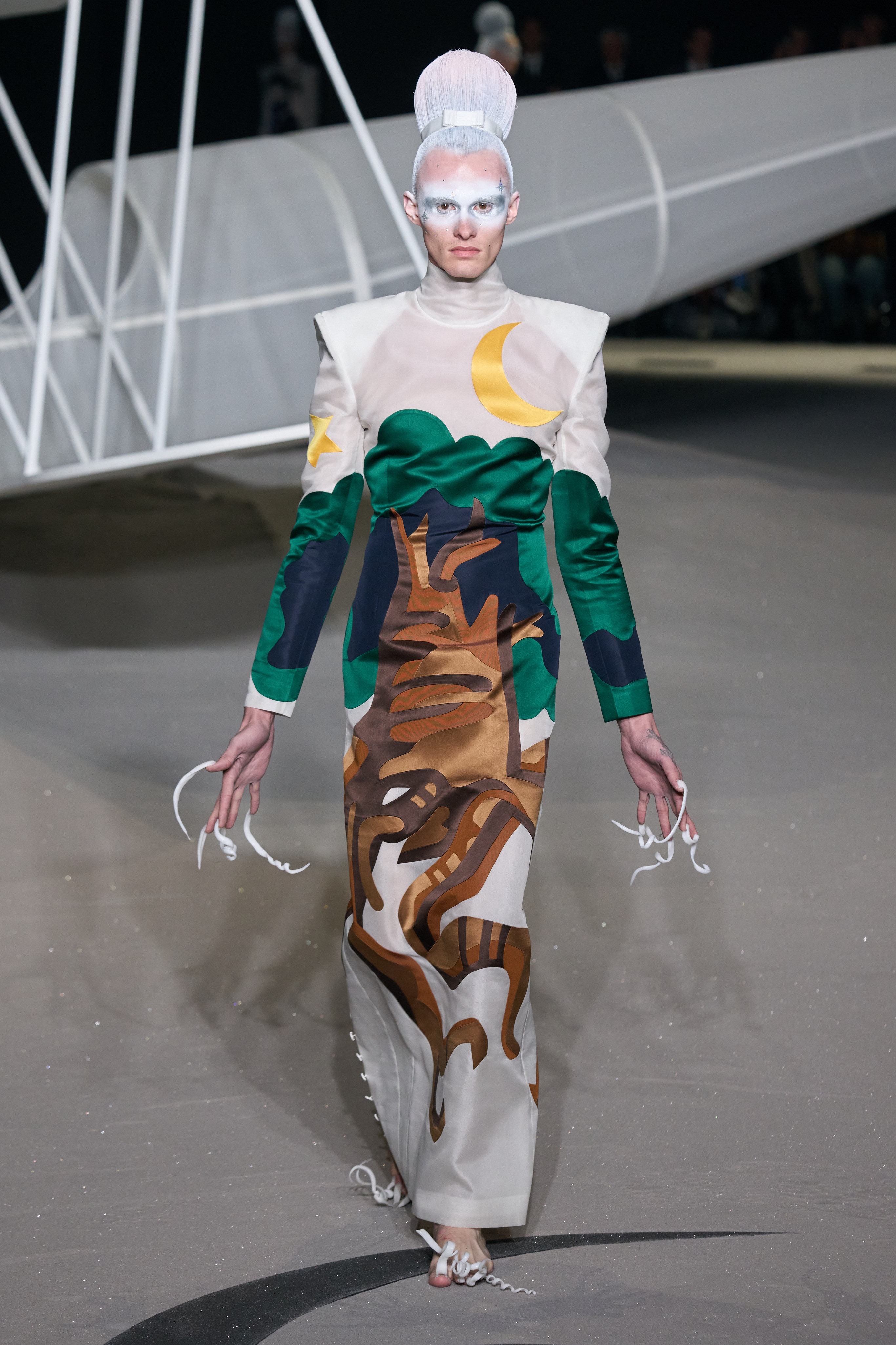 The circular runway, painted like a traditional clock and surrounded by a crashed plane, was thought-provoking and impressive. The concept of futurism transcended on the runway through avant-garde designs.