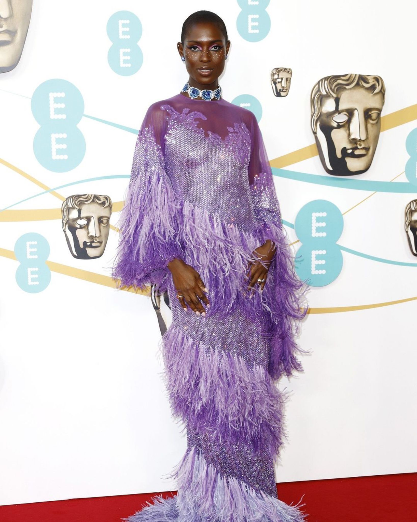Taking a different direction, yet following this year’s favorable color code, Queen & Slim star, Jodie Turner-Smith arrived at the BAFTAs in a lavender and violet ombre feather and sequin dress by Gucci. She accessorized with a diamond azure floral choker necklace and got creative with her makeup. She had rhinestones meticulously place below her cat-eyes and her ensemble, feeling both luxurious and eccentric, could be captioned, “made you look.”