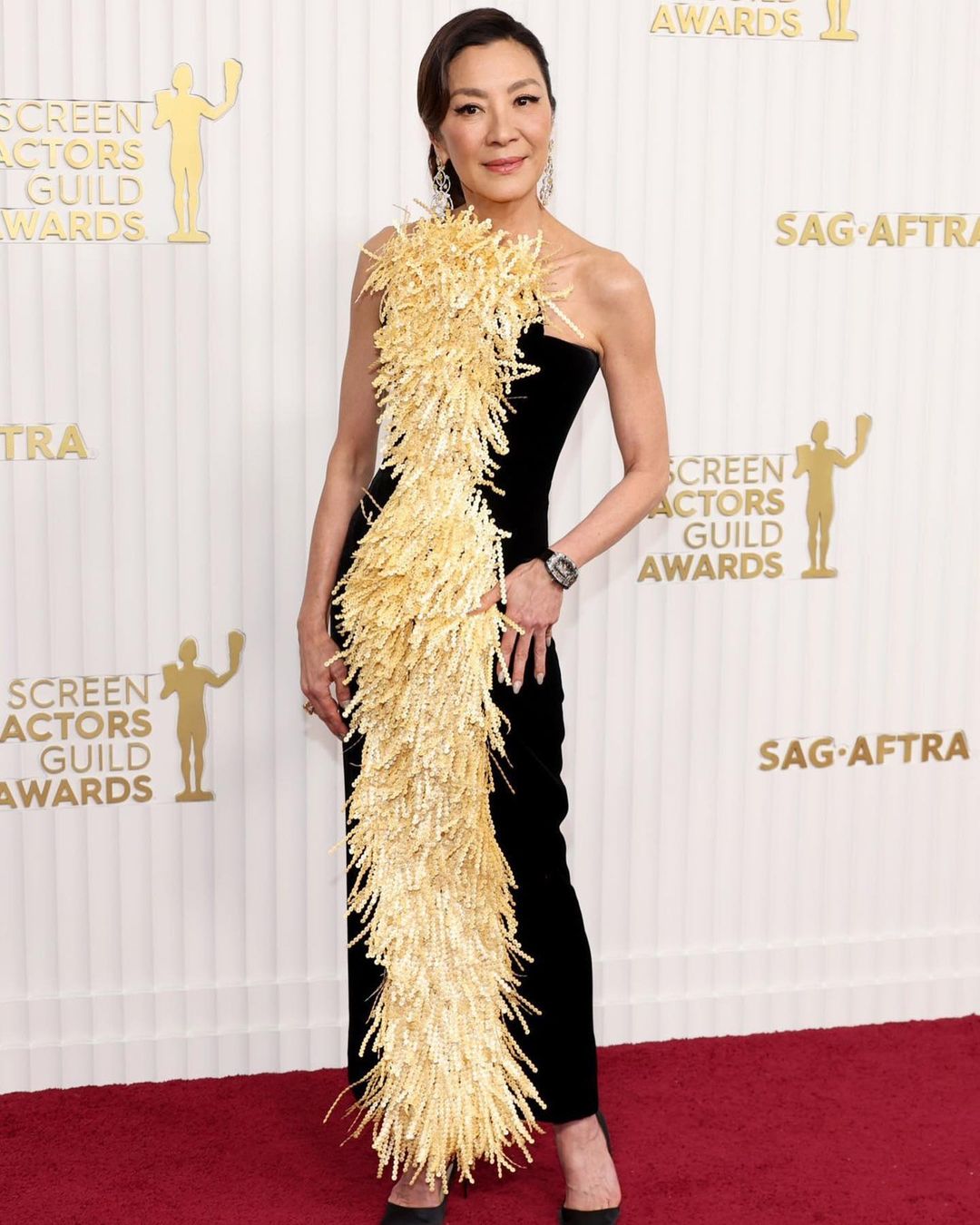 Tonight, Hollywood honors the year’s best in film and television at the 29th Screen Actors Guild Awards. Commonly known as the SAG Awards, the celebratory ceremony’s held at the Fairmount Century Plaza in Century City, California. Top categories include Best Female Actor in a Leading Role, where the competition is fierce between three red carpet style stars: Viola Davis, Cate Blanchett, and Michelle Yeoh, while the supporting actress category could see another win for Angela Davis.