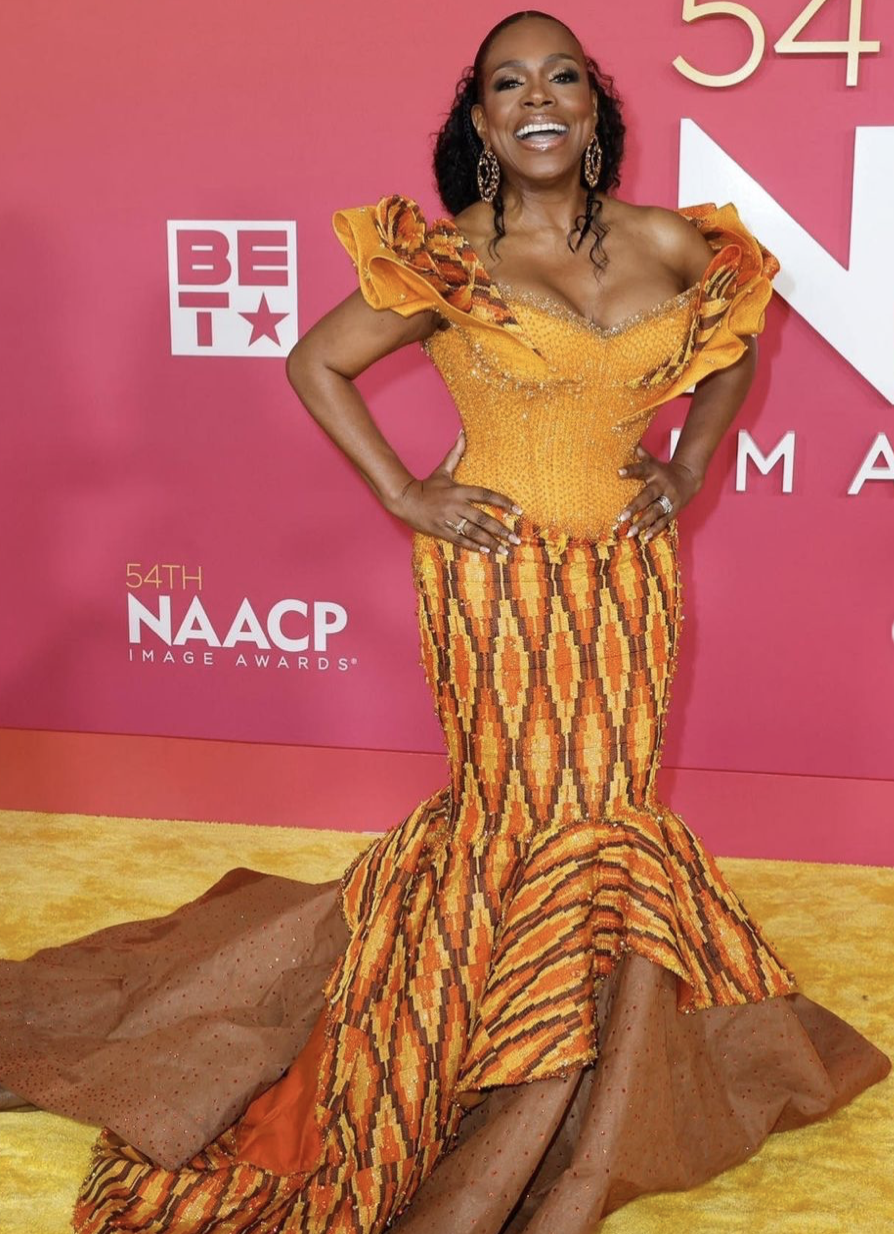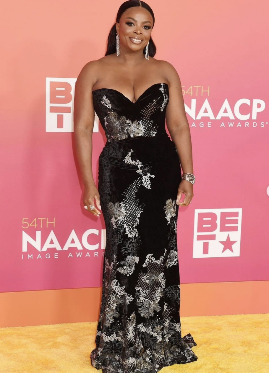 In addition to Quinta Brunson, stars Sheryl Lee Ralph and Janelle James also represented for Abbott Elementary at the NAACP awards. Ralph was intentional about her gown, choosing the wear a Ghanaian designer which felt appropriate. She slayed in a yellow multicolor Kente Pistis Ghana dress that felt reminiscent of the mother land, Africa. While comedian Janelle James chose to wear a black velvet Christian Siriano PF23 dress that very rich in texture and had silver sparkles and flowers embroidered throughout her gown