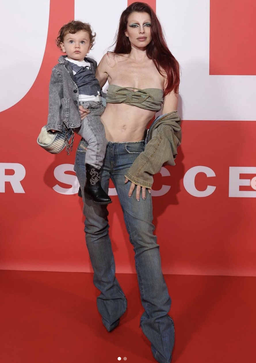 Denim was a major staple during Milan Fashion Week and model Julia Fox made it evident in her denim on denim look by Diesel. She rocked a denim bandeau top with an off the shoulder denim jacket and rustic denim jeans that look like they were attached to her denim boots. We couldn’t help but to be in awe by her son Valentino who was twinning with his mother in a denim-on-denim look.