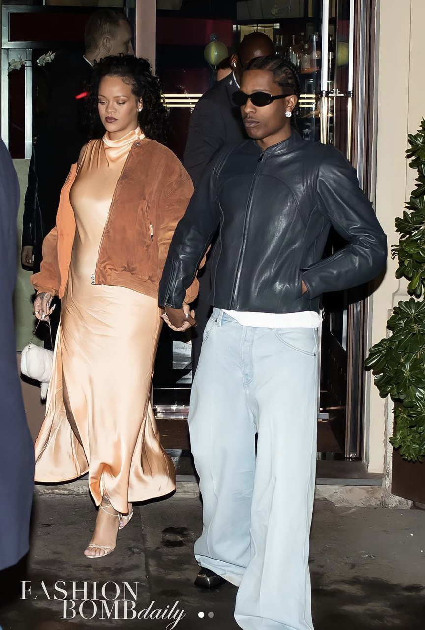 A$AP Rocky was also spotted walking hand and hand with Rihanna on another occasion while in Milan. Rihanna strutted in a peach Lapointe dress layered with a PDF bomber jacket that was styled with open toe heels. Contrary to his look at the Gucci show, A$AP Rocky kept it classic with a black leather jacket, white tee, and light wide leg denim pants. Most notable was A$AP’s square toe shoes with silver hardware.