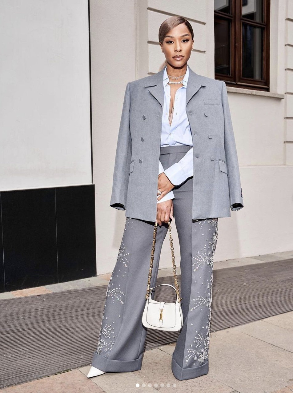 Savannah was the moment at Milan fashion week and in another look she was draped in a full SS23 Gucci grey double-breasted suit with a blue button up skirt, and statement trousers that had rhinestones perfectly planted down the seams of her pants. She accessorized with a pure white Gucci mini bag and Gucci pumps.