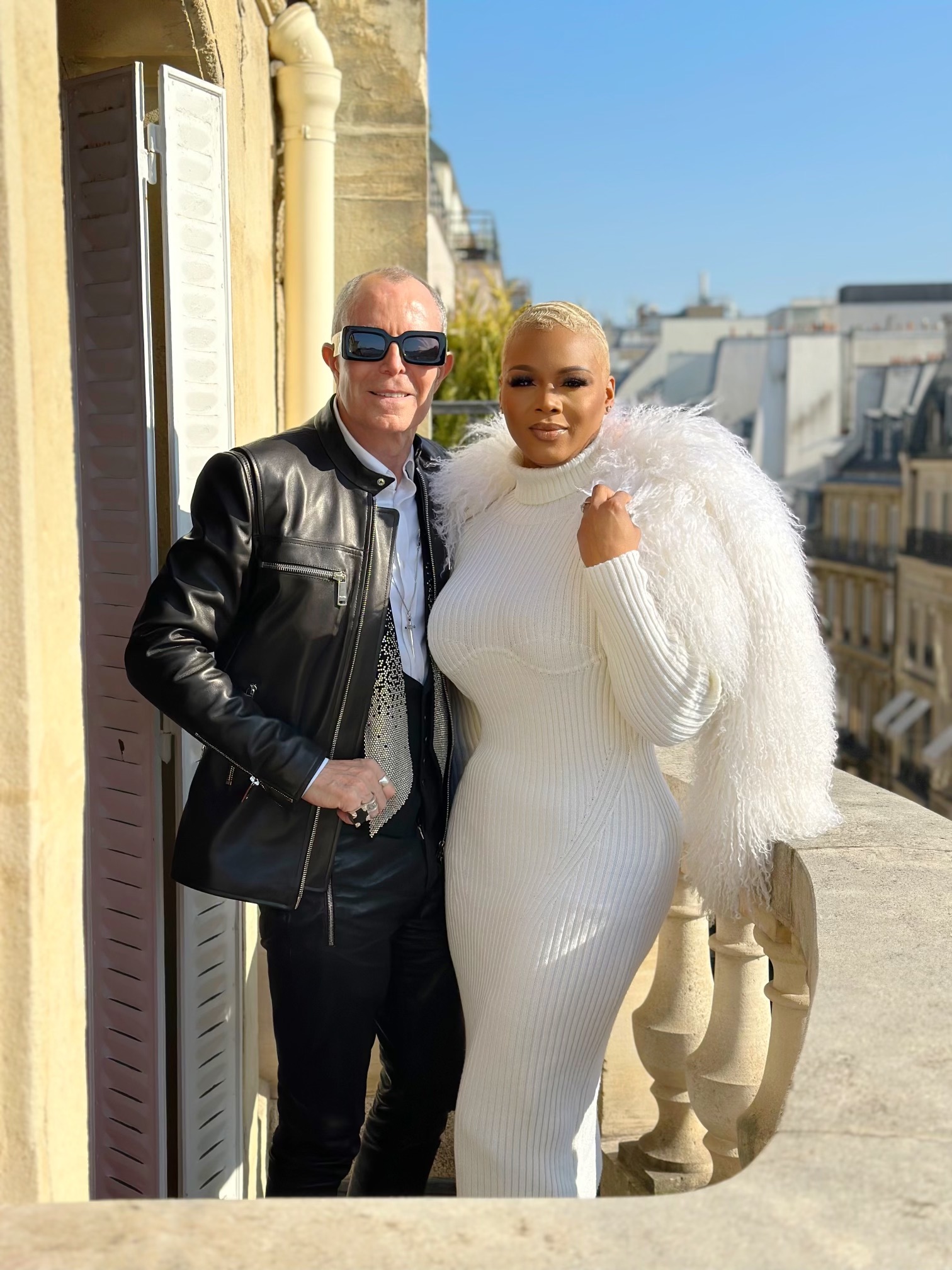 Towards the end of Claire’s trip to Paris Fashion Week, Claire made a pitstop to meet with the designer of Jitrois who was delighted to have her preview his latest presentation. Jitrois collection was edgy, and over-the-top with fringe pants, Moto jackets and rich Mongolian furs such as the white off-the-shoulder fur that Claire is wearing below.