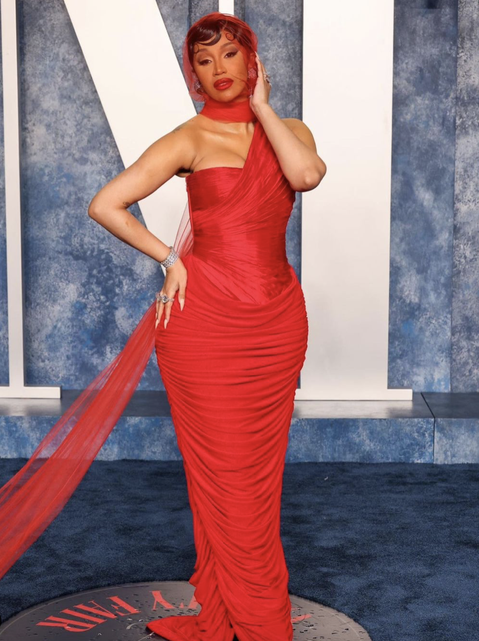 Grammy award winning rapper Cardi B arrived to the Vanity Fair red carpet in a scarlet red Robert Wun gown that was asymmetrically draped with tulle wrapped around her glamorous face that was beat by the Gods. She looked absolutely breathtaking and her look was reminiscent of Alexander McQueen or Simone Rocha. The ‘Bodak Yellow’ star looked delicate yet strong and it’s great to see her tapping into her soft girl era.