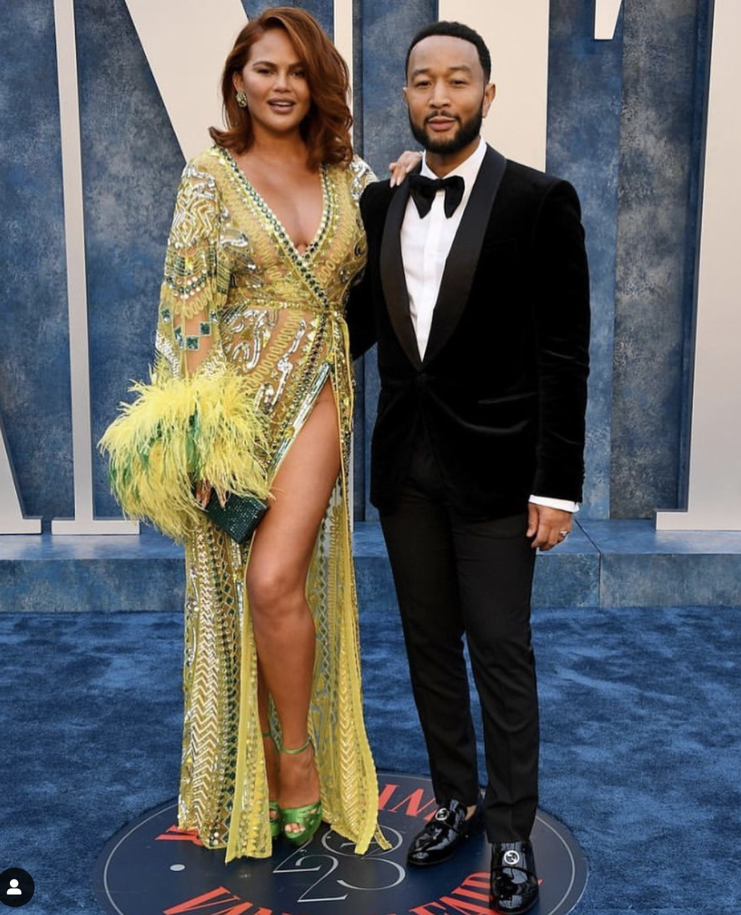 One of our favorite couples, Chrissy Teigen and John Legend arrived arm in arm looking magnificent and like they were made for each other. Chrissy wore a sensational lime green beaded Zuhair Murad gown with feather sleeves and open toe platforms. While John Legend looked classic in a black Gucci suit with black Gucci loafers. Chrissy’s auburn blow out was right on trend as it’s all about the brownish red hair color for Spring/Summer 2023.
