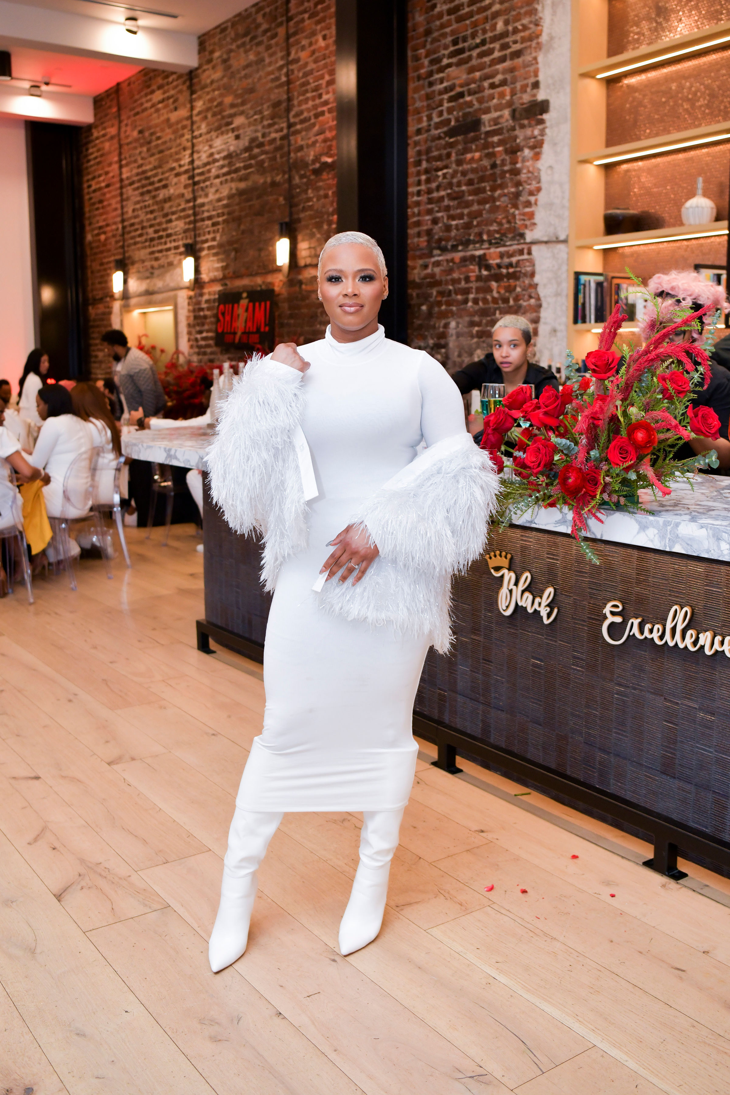 Recently Claire attended the Black Excellence Brunch, where she networked, continued to foster her community of like-minded peers and delivered a look. In white on white, Claire showed up and out in a bodycon long sleeve turtleneck dress by Naked Wardrobe and over the knee boots by FEMME LA, but the statement piece pulling it all together? Her white feather-adorned jacket by wearNIKI.